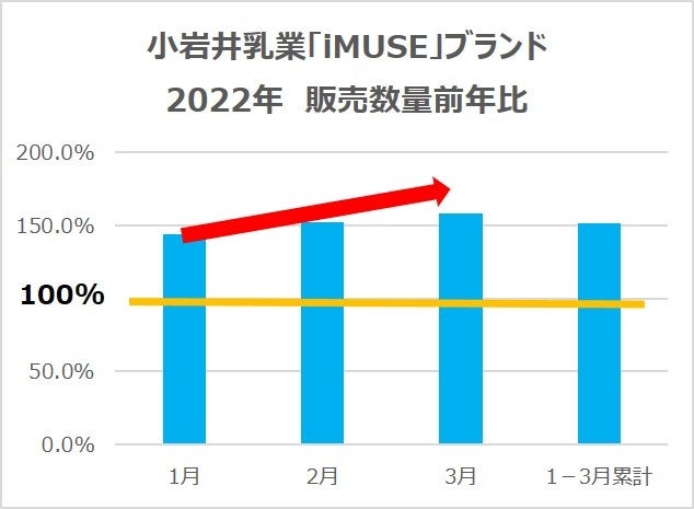 ・昨年9月に新発売した「小岩井 iMUSEヨーグルト」群は、健康意識、免疫ケア意識の高まりとともに習慣的に摂取・購入いただくお客様が増加し、2021年には、2020年比で年間販売数量が約1.5倍になりました。今年も、新たにお取り扱いいただく量販店が増加し、2022年1~3月の販売数量は前年比約1.6倍と好調を維持しています。