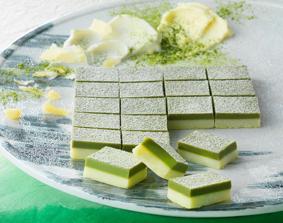 宇治抹茶をブレンドしたチョコレートと、北海道産の3種のチーズ(マスカルポーネ、ゴーダ、クリームチーズ)を使用したホワイトチョコレートを2層に重ね、宇治抹茶を使用したチョコレートのパウダーをかけました。