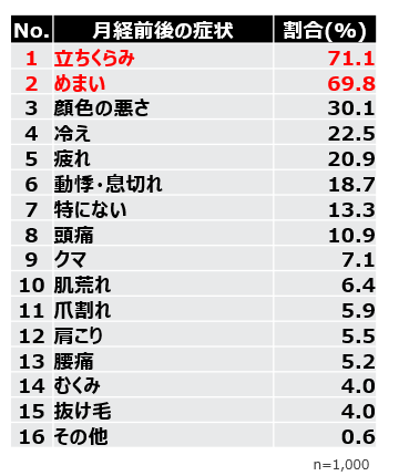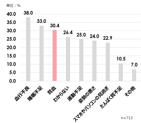 月経前後に感じる不調について聞いたところ、「頭痛」「腰痛」「疲れ」「肌荒れ」など様々な症状が挙がりました。実はこれらの多くは貧血が原因になっている可能性がある症状です。月経前後に感じる症状の中で、いずれかの「貧血関連症状」を選択した人は71.3%もいることが分かりました。7割以上の女性が貧血にともなう不調を感じている可能性があることが明らかになりました。