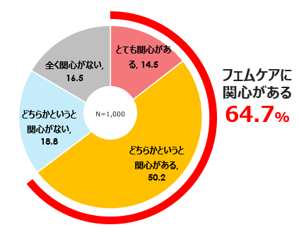 フェムケア(女性の健康問題)の関心について聞いたところ、「とても関心がある」(14.5%)、「どちらかというと関心がある」(50.2%)と回答しました。フェムケアに関心を持つ人は合計で64.7%に達し、多くの女性がフェムケアに関心があるということが明らかになりました。