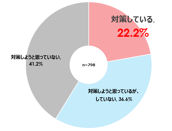 「月経前後に貧血関連症状がある」「貧血の自覚がある」「貧血の診断を受けた」いずれかに当てはまる人に対し、貧血対策の有無について聞いたところ、「対策をしている」(22.2%)と低い実態が浮き彫りとなりました。貧血の可能性があっても、多くの人は対策をしていないことが明らかになりました。