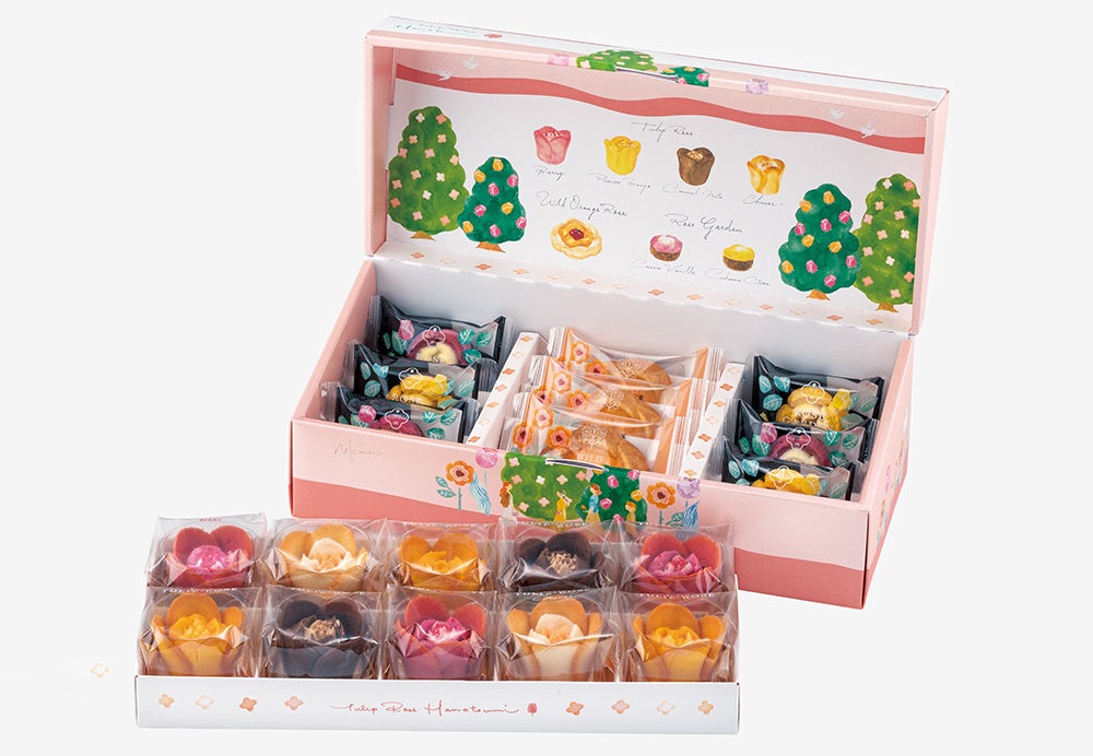 お花のスイーツがあふれだす2段重ねの豪華なボックスは、お花が咲きほこった春のチューリップタウンの街角を行き交う人々を描いた限定デザイン。こうばしい香りあふれる季節限定「チューリップローズ チーズ」をはじめ、7種のお花が楽しめる詰合せで登場します。ぽかぽか陽気でたのしむパーティーや、大好きなお母さんへ笑顔を届けるサプライズギフトに!