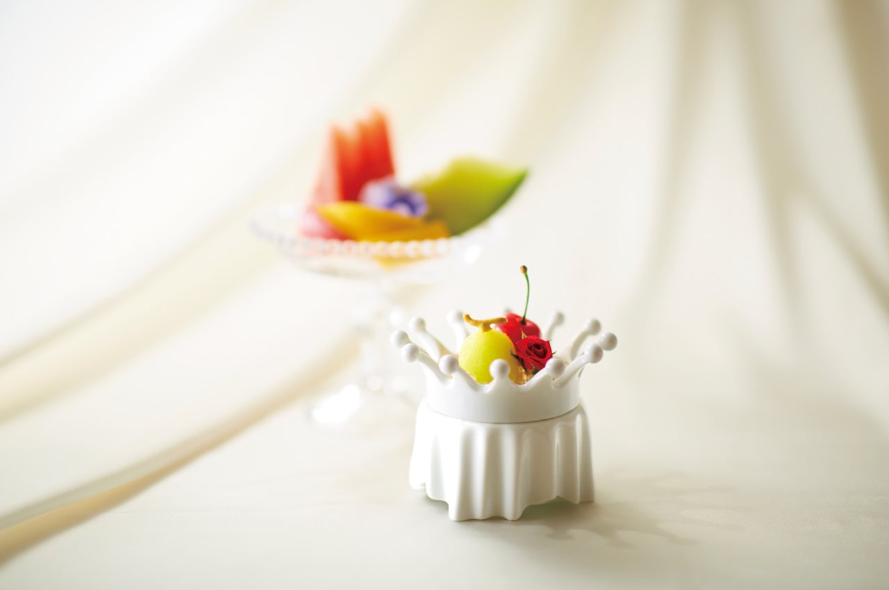 アフタヌーンティーセットの上段には、ティアラをかたどったシュー飾り、そして結婚式のキャンドルサービスをイメージした苺のグラスケーキ、フラワーシャワーから連想される花をイメージして、食べられる花であるエディブルフラワーを散りばめました。カットフルーツはタカノフルーツパーラーのシーズナルメニューにもなっている「メロン」を食べ比べていただけます。