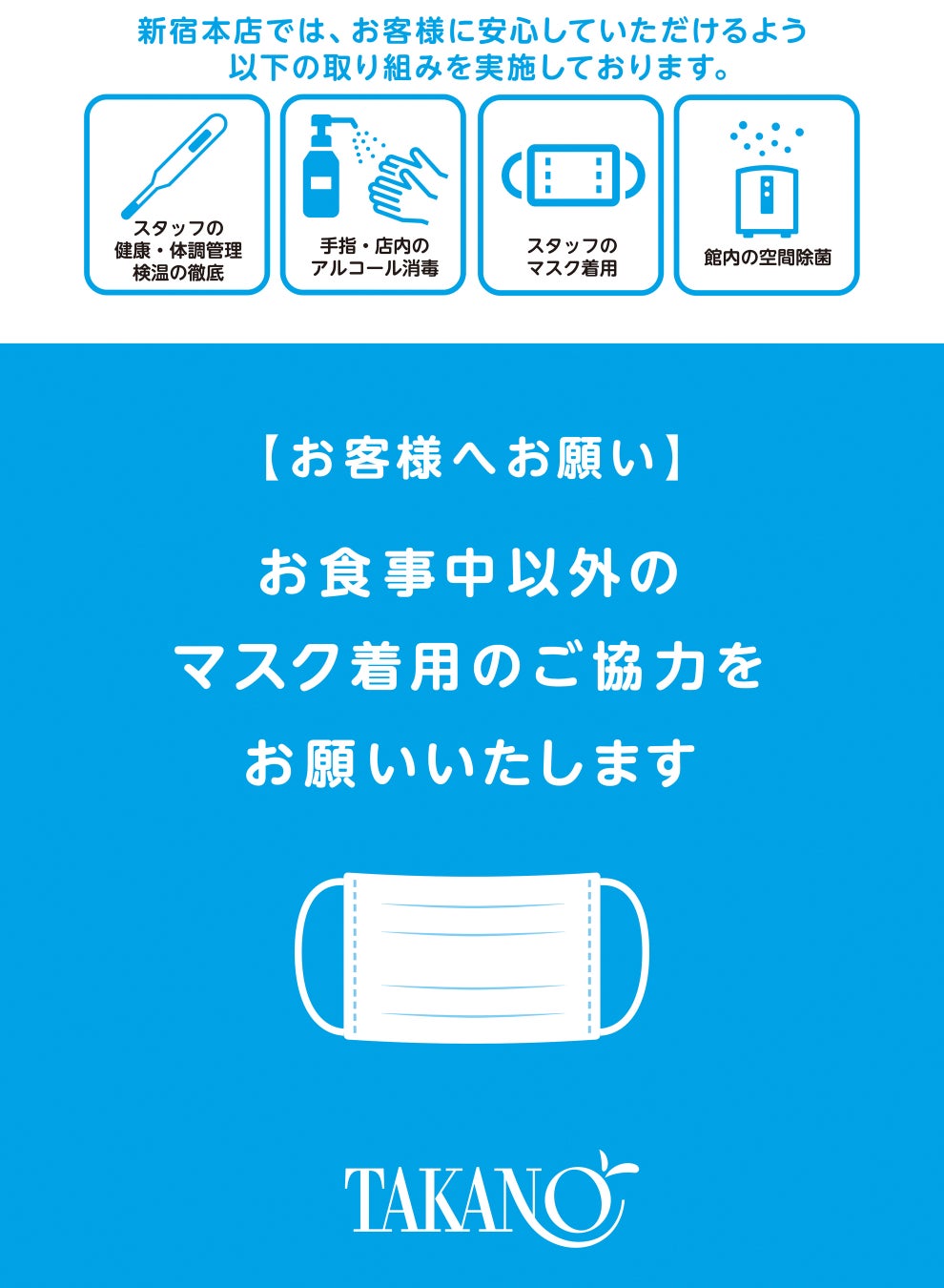 タカノフルーツティアラでは、お客様と従業員の安全と健康を最優先とし、下記の感染拡大防止策を実施しております。