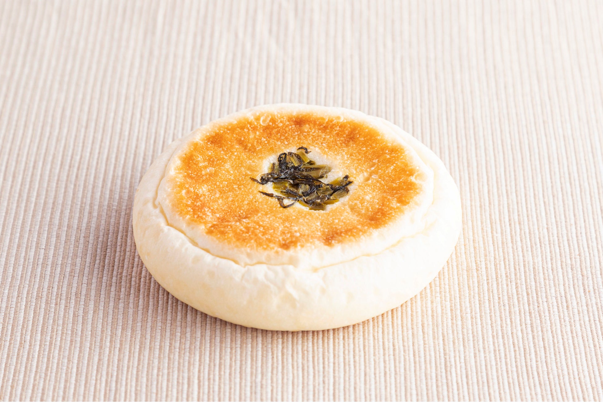 長野県の特産品「野沢菜」をたっぷり包んでおやき風に焼き上げました。シャキシャキの野沢菜がもっちりとしたパンによく合います。
