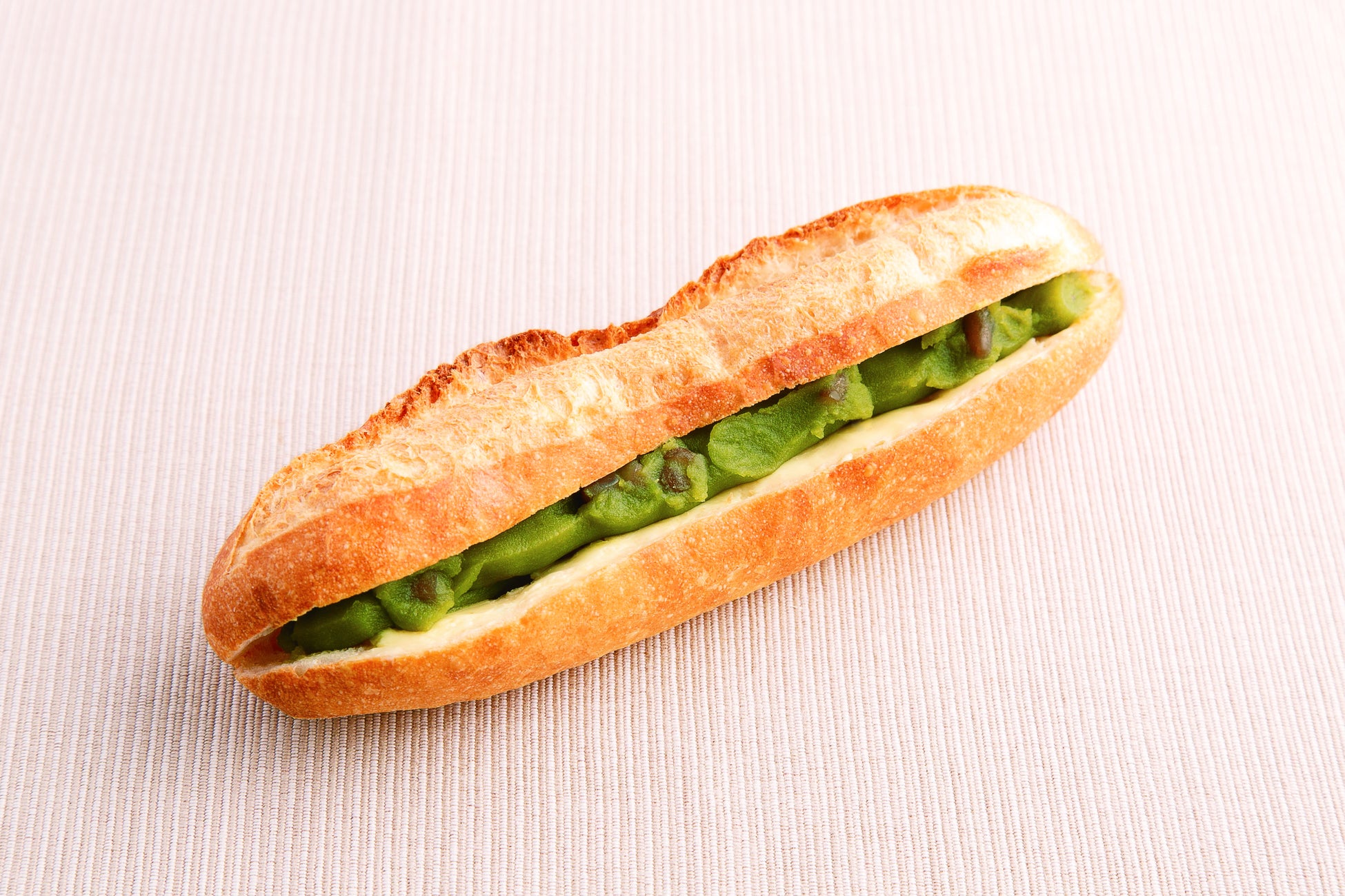 パリパリのフランスパンにバターをたっぷり塗り、風味の良い宇治抹茶あんをたっぷりサンド。あんこのアクセントにあずきを入れ、バターとよく合うマイルドなフランスパンに仕上げました。