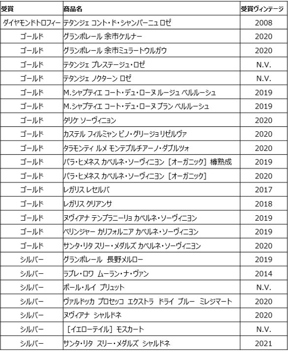 サッポロホールディングス(株)のグループ企業であるサッポロビール(株)が販売する「テタンジェ コント・ド・シャンパーニュ ロゼ 2008」が一般社団法人 ワインアンドスピリッツ文化協会主催の「The 9th Japan Women’s Wine Awards 2022(通称:第9回サクラアワード2022)」にて、ダイヤモンドトロフィーを受賞しました。また、「グランポレール 余市ケルナー 2020」「M.シャプティエ コート・デュ・ローヌ ルージュ ベルルーシュ 2019」「パラ・ヒメネス カベルネ・ソーヴィニヨン[オーガニック]樽熟成 2019」をはじめとする16商品もゴールドを受賞しました。