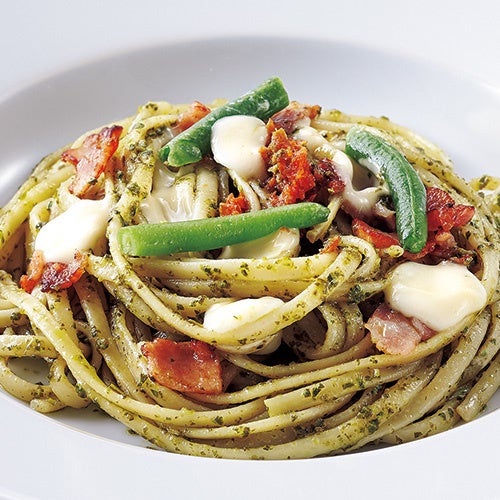 爽やかな風味のバジルペーストに、やさしい酸味のドライトマト、クリーミーなモッツァレラチーズを合わせました。ベーコンの小気味よい塩気とコクも加わって、もっちりしたリングイネの美味しさを高めています。