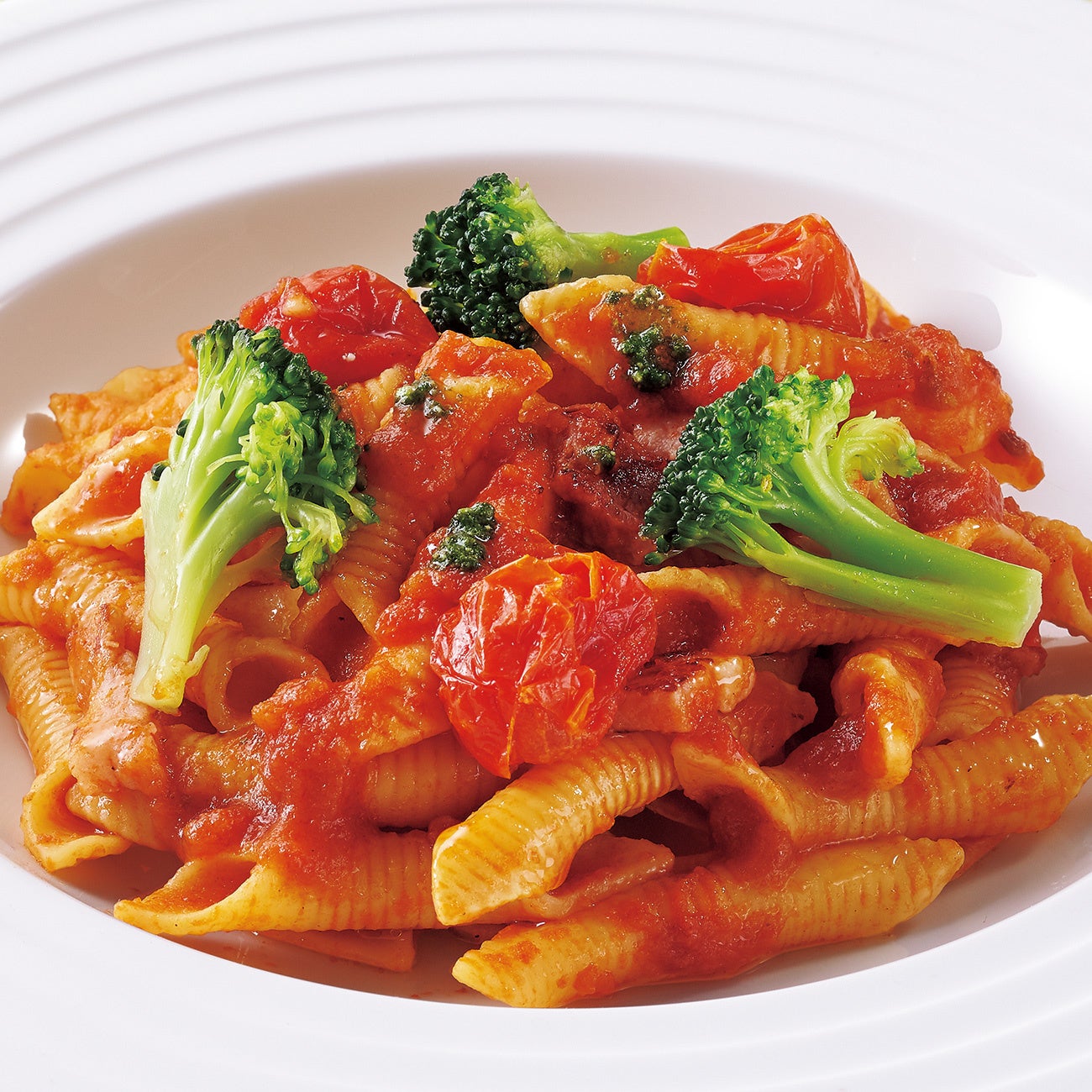加熱したトマトからあふれる旨みを活かした、瑞々しくフレッシュなトマトソースが魅力。アクセントのバジルソースが程よく効いて、美味しさを一層引き上げています。表面に筋があるガルガネッリはソースがよく絡み、ソース、パスタ、具材の三位一体の美味しさが愉しめます。