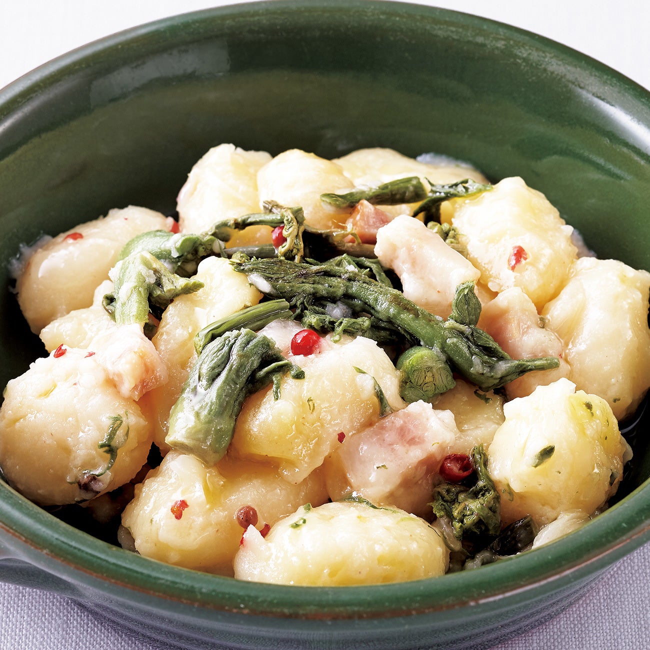 たらの芽やわらびといった日本ならではの山の幸で彩った、春らしい一皿。ベーコンや玉葱などの具材を白ワインで香りづけし、チーズを加えてクリーミーに仕上げました。もっちりしたポテトニョッキがやさしい味わいです。