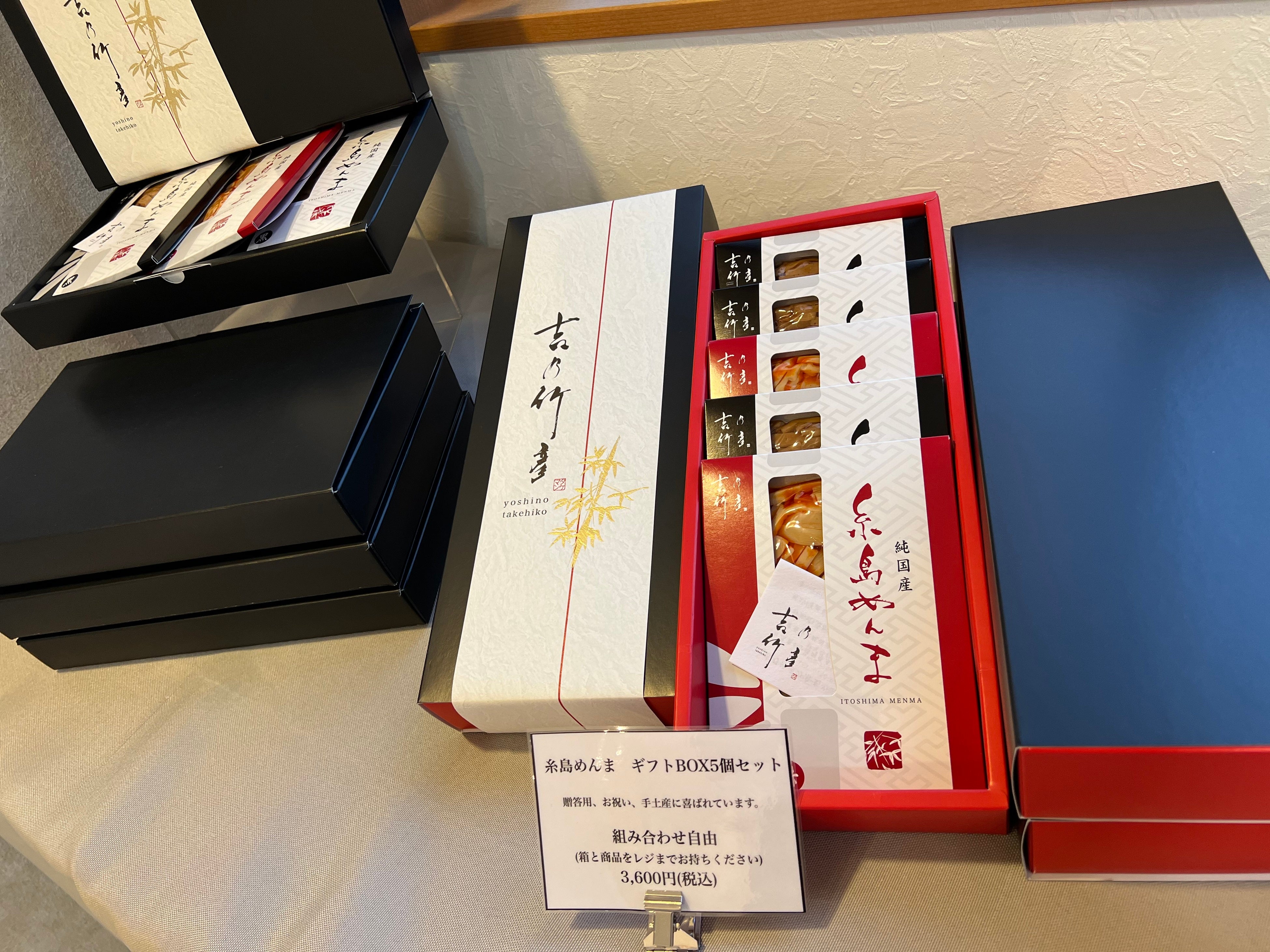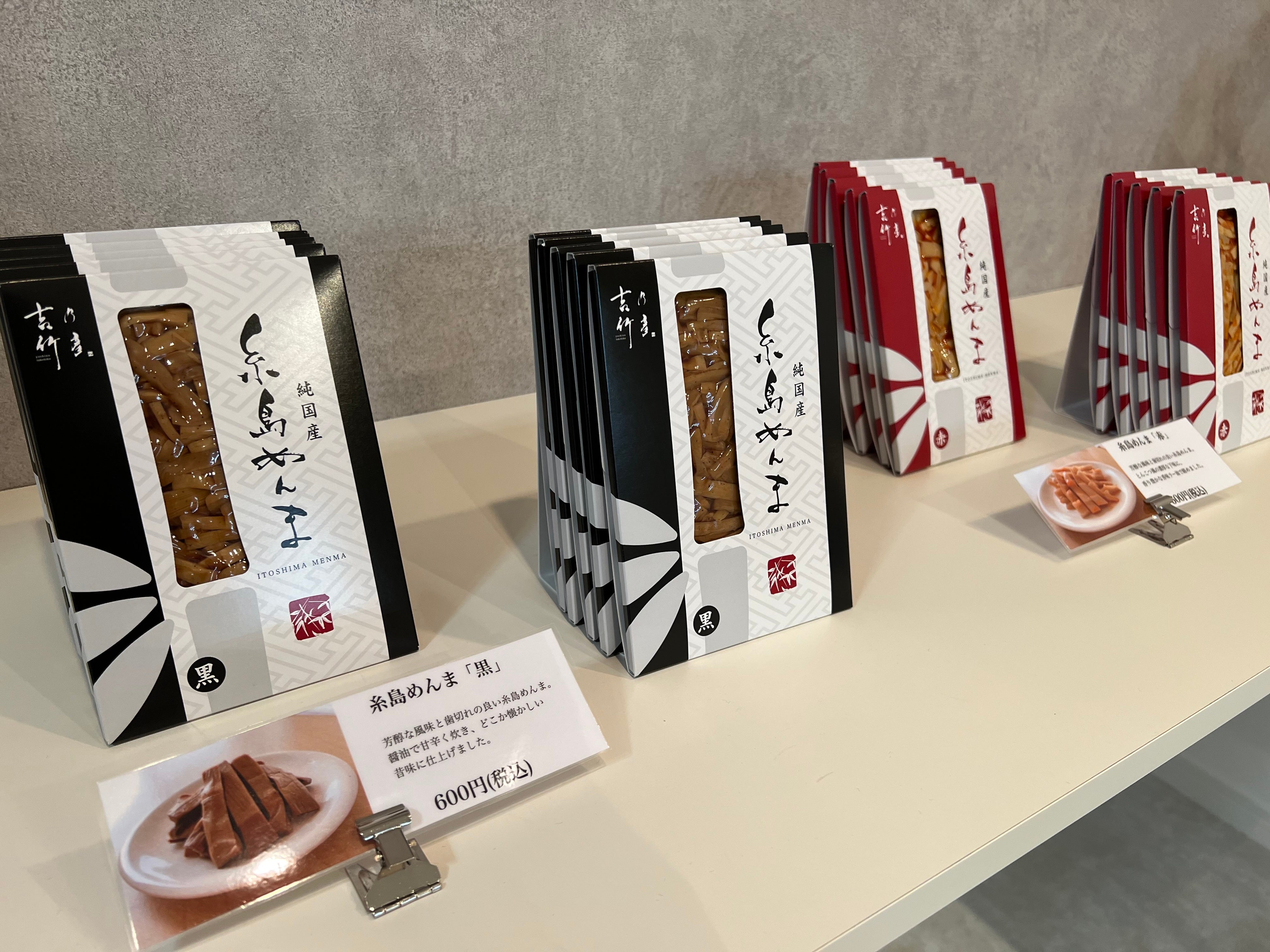 お店に展示してあるメンマは、地元糸島市産の孟宗竹を使用した「純国産糸島めんま」をはじめ、大変珍しいメンマのお菓子「食らえ!メンマスナック」や、有名ラーメン店などが実際に使用しているプロ用のメンマなどがある。糸島めんまは詰め合わせもできて贈答用として嬉しい糸島土産になる。