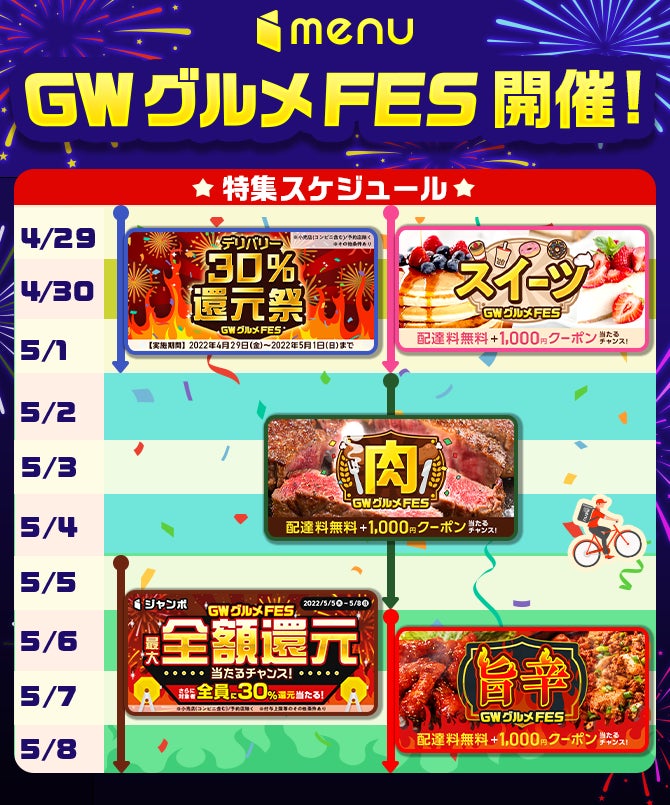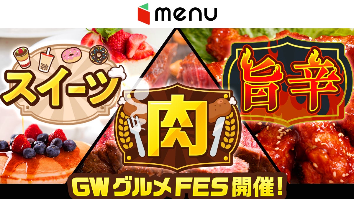 デリバリーアプリ「menu(メニュー)」は、ゴールデンウィーク期間限定キャンペーン「GWグルメFes!」を2022年4月29日(金)から5月8日(日)まで開催します。期間中は、タイムテーブルに合わせてスイーツ、肉、旨辛のジャンルごとのお料理を配達料無料でお届けいたします。また、すべてのFesへの参加(注文)で後日1,000円分のクーポンが当たります。ぜひこの機会に、お得にご利用いただき、おうちで美味しいお食事をお楽しみください。