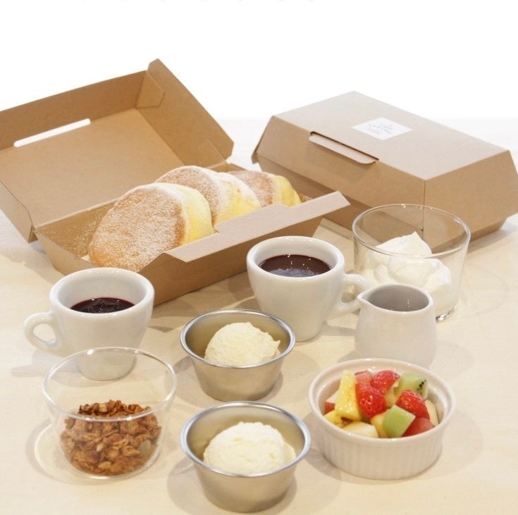 フワフワパンケーキ3枚にお好きなトッピングが、3つ選べるお得な限定企画です。パンケーキは作ってから2時間以内にお召し上がりいただくことをお願いしております。ご予約いただきましたお時間からお受け取りが遅れた時はパンケーキを作り直しになる場合がございます。その場合店内でパンケーキを作り直すお時間を頂戴することとなりますので予めご了承下さい。