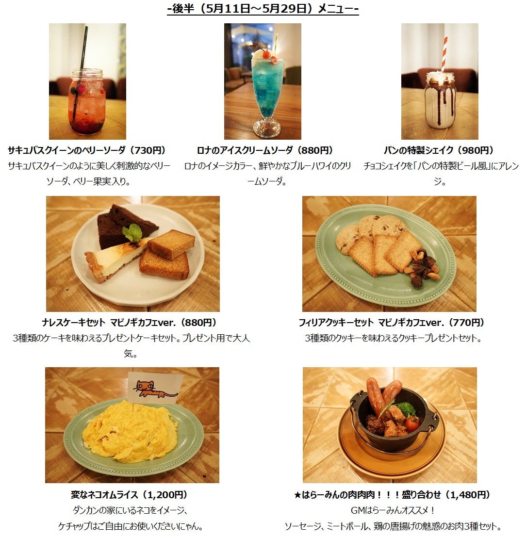 『マビノギ』プレイヤーなら一度は目にしたことのあるお馴染みのゲーム内アイテムを再現したものや、GMがそれぞれ考案したものなど、20種以上にもおよぶオリジナルメニューを注文いただくと、ここでしか入手できないランチョンマット/コースターのノベルティが入手できます。