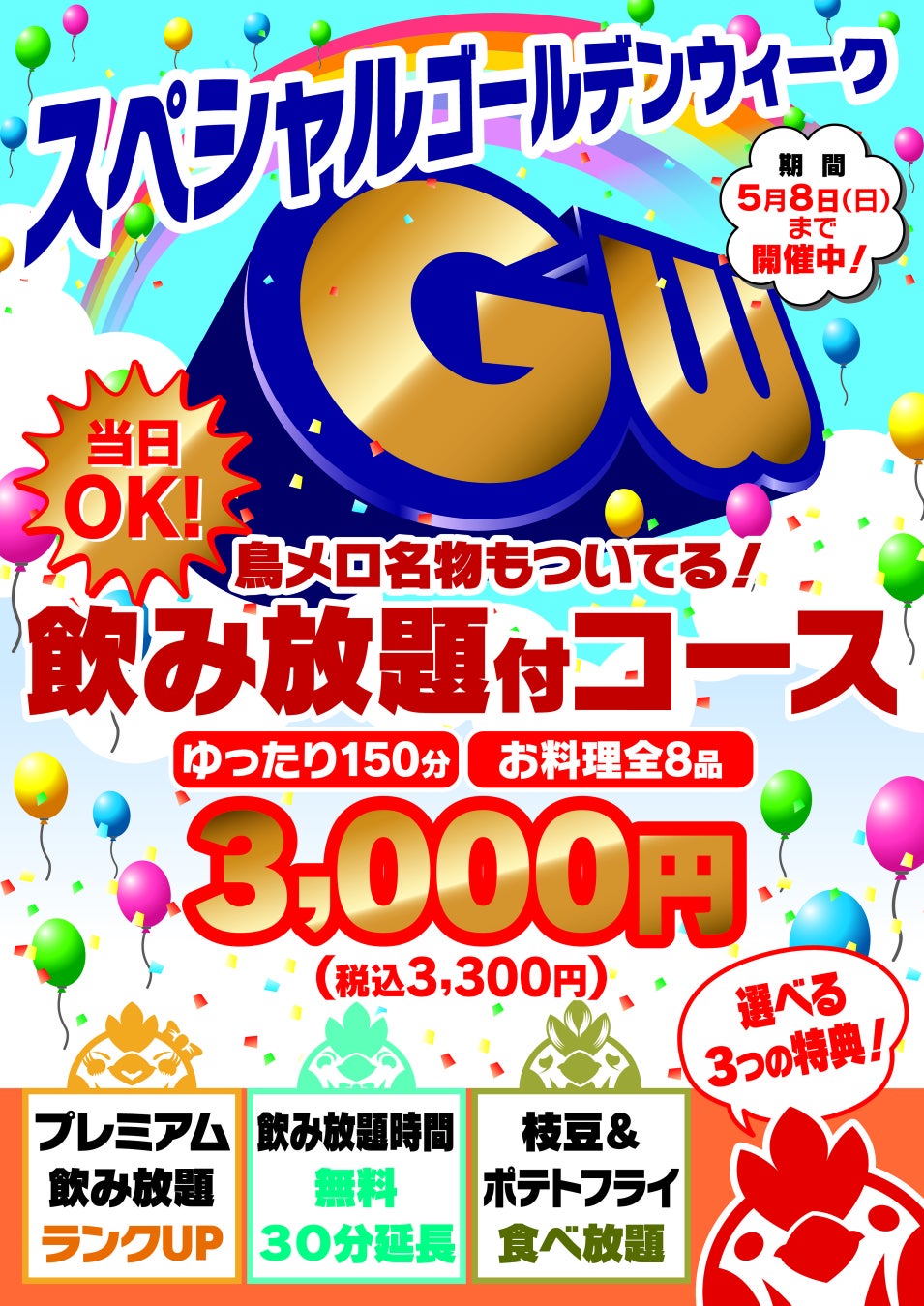 2022年4月29日(金)~5月8日(日)の期間中、当日受付OK!3つの特典が選べる、飲み放題付コース「スペシャルゴールデンウィーク」を開催します。今年のゴールデンウィークは2年ぶりに多くの方々が旅行や帰省と全国各所へ足を運ばれることと思われます。そこで久々に会う大切なご友人や親戚の方との楽しい外食の場を提供させて頂きたく「スペシャルゴールデンウィーク」と称し、3,000円(税込3,300円)お料理8品、飲み放題コースご注文で選べる3つの特典をご用意させて頂きました。特典内容は通常50種類から80種類の飲み放題へランクUPできる①プレミアム飲み放題ランクUP、久々の再開でゆっくりお酒を楽しみたい方へ②飲み放題時間30分無料延長、お食事が足りないお客様へは③枝豆&ポテトフライ食べ放題の3つから選べる特典内容です。ぜひこの機会に三代目鳥メロのこだわりの料理とお酒と共にお手軽にお楽しみください。