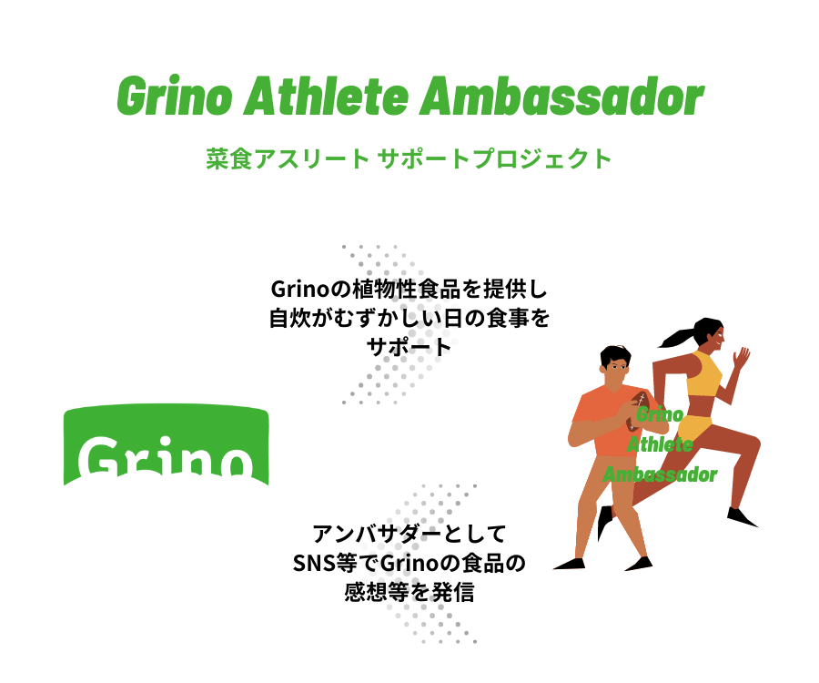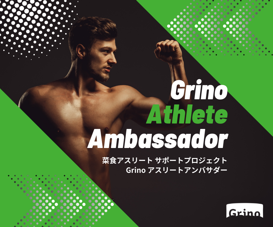 「Grinoアスリートアンバサダー」は、菜食を中心とした身体づくりに取り組んでいる、もしくは これから取り組もうとしているアスリートへ、Grinoのプラントベースフードを月に数食分提供させていただくプロジェクトです。