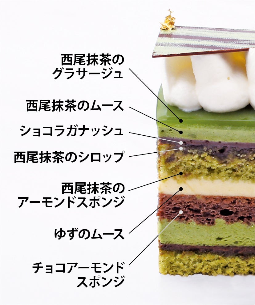 抹茶の美味しさの決めては苦味ではなく「甘み」と語る、京都宇治の老舗茶問屋「北川半兵衞商店」の茶の匠と一緒に、洋菓子に合うオリジナルの抹茶「京の鶯 ( うぐいす)」を作りあげました。 その味わいと香りをとじこめたムースやガナッシュを存分に味わうケーキ(左画像)と、西尾の抹茶の豊かな香りと鮮やかな色合いを生かして、ゆずやショコラとのマリアージュを絶妙に表現したオペラ (右画像)の2品をお届けいたします。