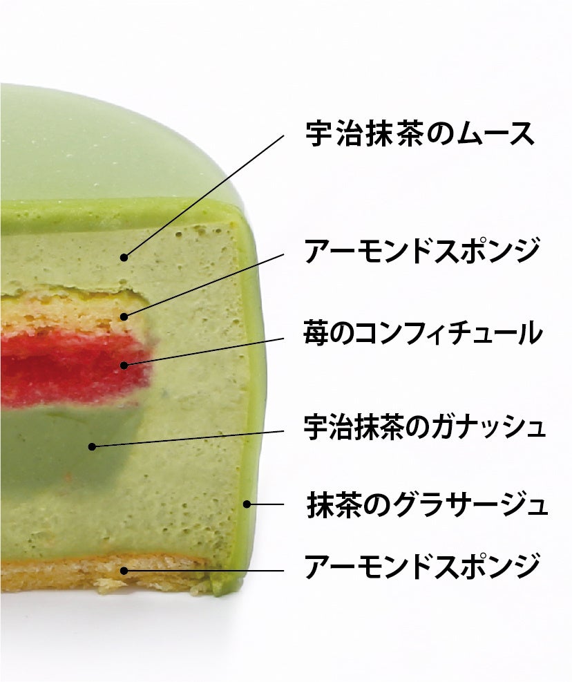 オリジナル特選宇治抹茶「京の鶯(うぐいす)」の深いうまみを生かしたムースで、抹茶のガナッシュと甘酸っぱい苺のコンフィチュールを包みました。 *5月末まで販売