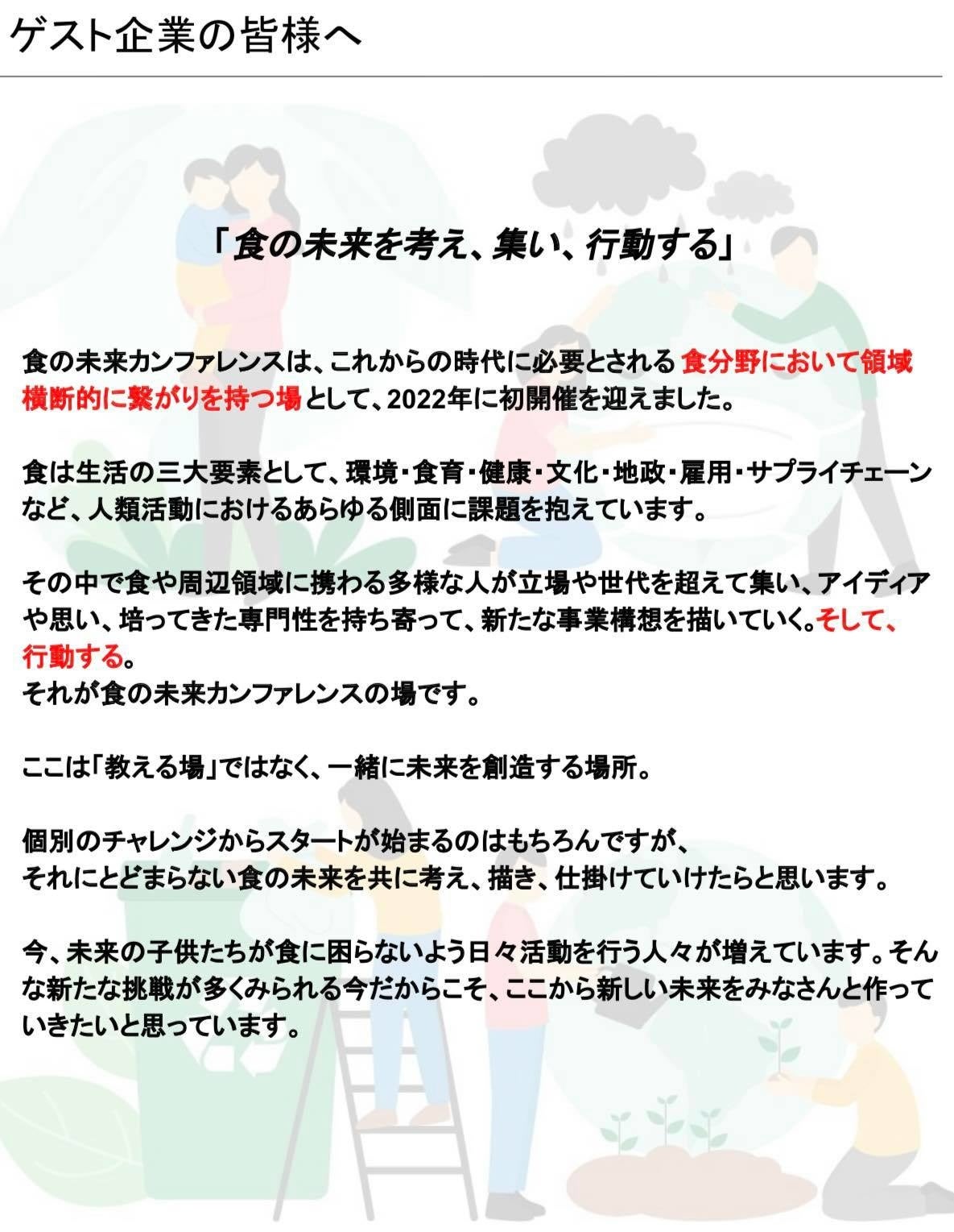 食の未来アワード(https://prtimes.jp/main/html/rd/p/000000313.000018590.html)とも連動し、カンファレンスにてアワード選定者の発表も予定しております。「食の未来を考え、集い、行動する」といったビジョンに共感し、共に突き進んでくださる仲間を募集中です。