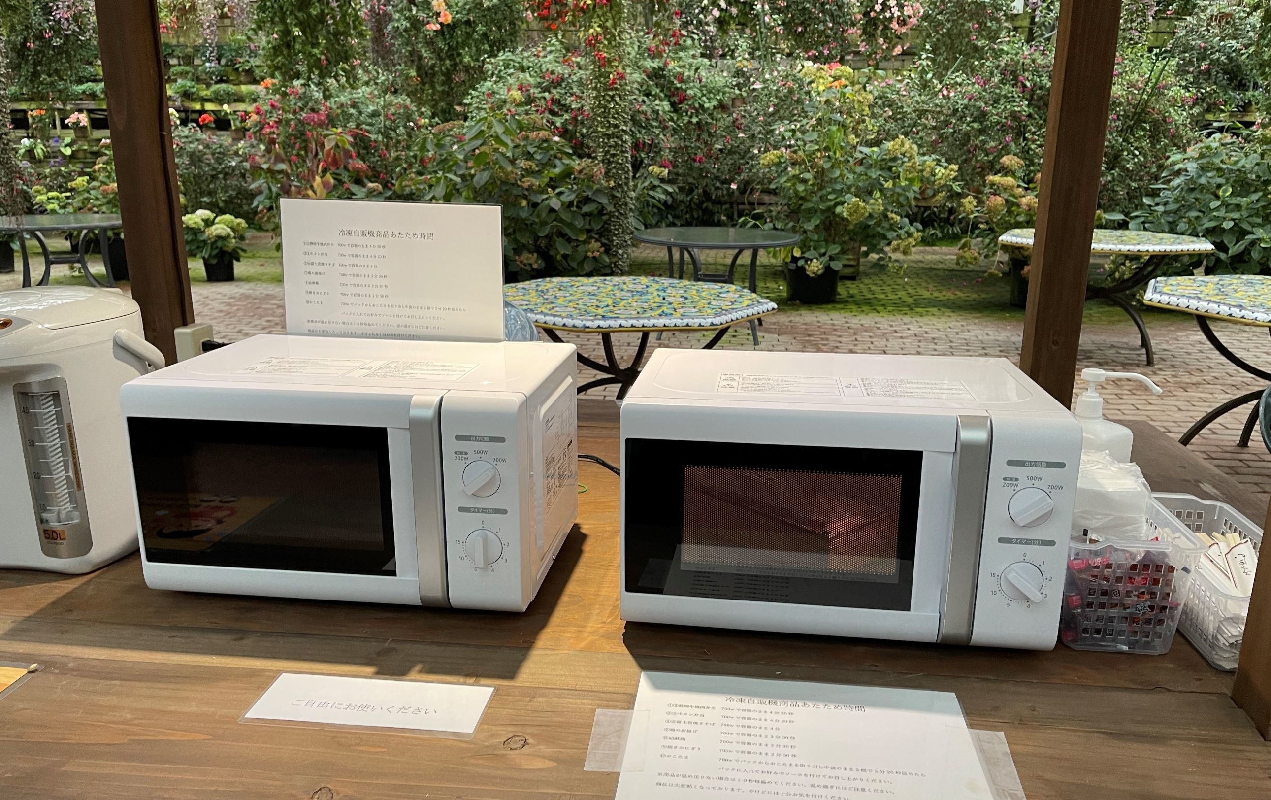 富士花鳥園は今話題の冷凍自販機「ど冷えもん」2台で皆さまをお待ちします。「ど冷えもん」は急速冷凍した作り立ての食品を-25~-18℃で保存しているので、質も味も作り立てそのまま。富士花鳥園内のハンギングフラワーの下で、鳥さんたちのさえずりを聴きながら富士山麓グルメ三昧ののんびりした時間が過ごせます。晴れていたら、外庭の池そばで富士山をみながらピクニック気分もよし、です。園内に電子レンジと湯沸かしジャー完備です。