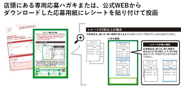 対象商品シールの購入レシートを取扱店に設置されている専用応募用紙、市販の郵便ハガキまたは
