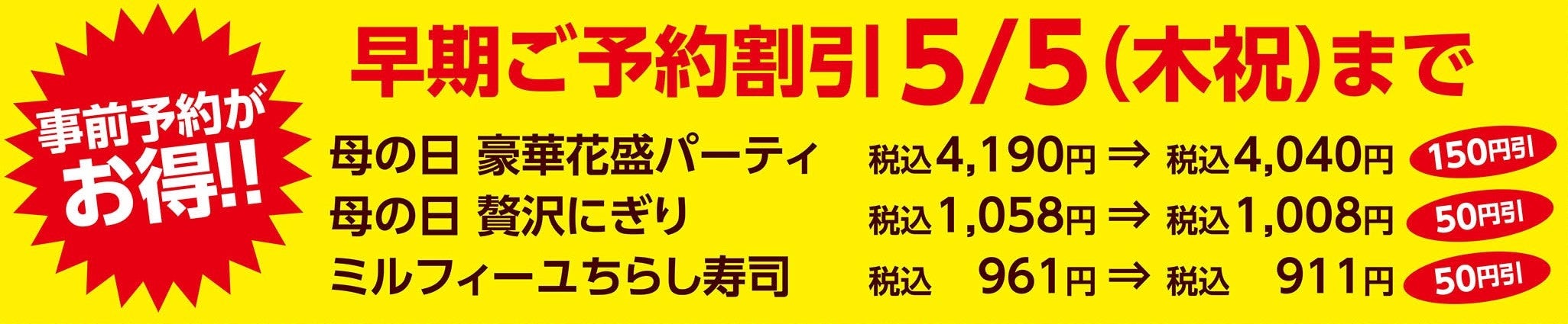 「贅沢にぎり」「ミルフィーユちらし寿司」は各税込50円引きとなりますので、