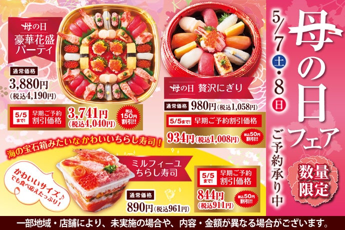 持ち帰り寿し店の「小僧寿し」「茶月」を運営する株式会社小僧寿し(本社:東京都中央区 代表取締役社長 良本 宣之)は、持ち帰り寿し店「小僧寿し」にて、5月7日(土)・8日(日)の期間限定で、「母の日フェア」を開催致します。