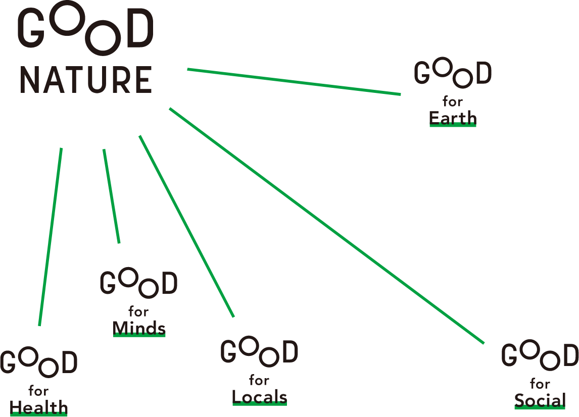 健康や環境にストイックに向き合うより、我慢せずに楽しみながら、健康的で良いものを自分らしく取り入れるライフスタイル“GOOD NATURE”という考え方です。当施設では、「体・心・地域・社会・地球にとって健康的で、しあわせであること」を大事にしています。