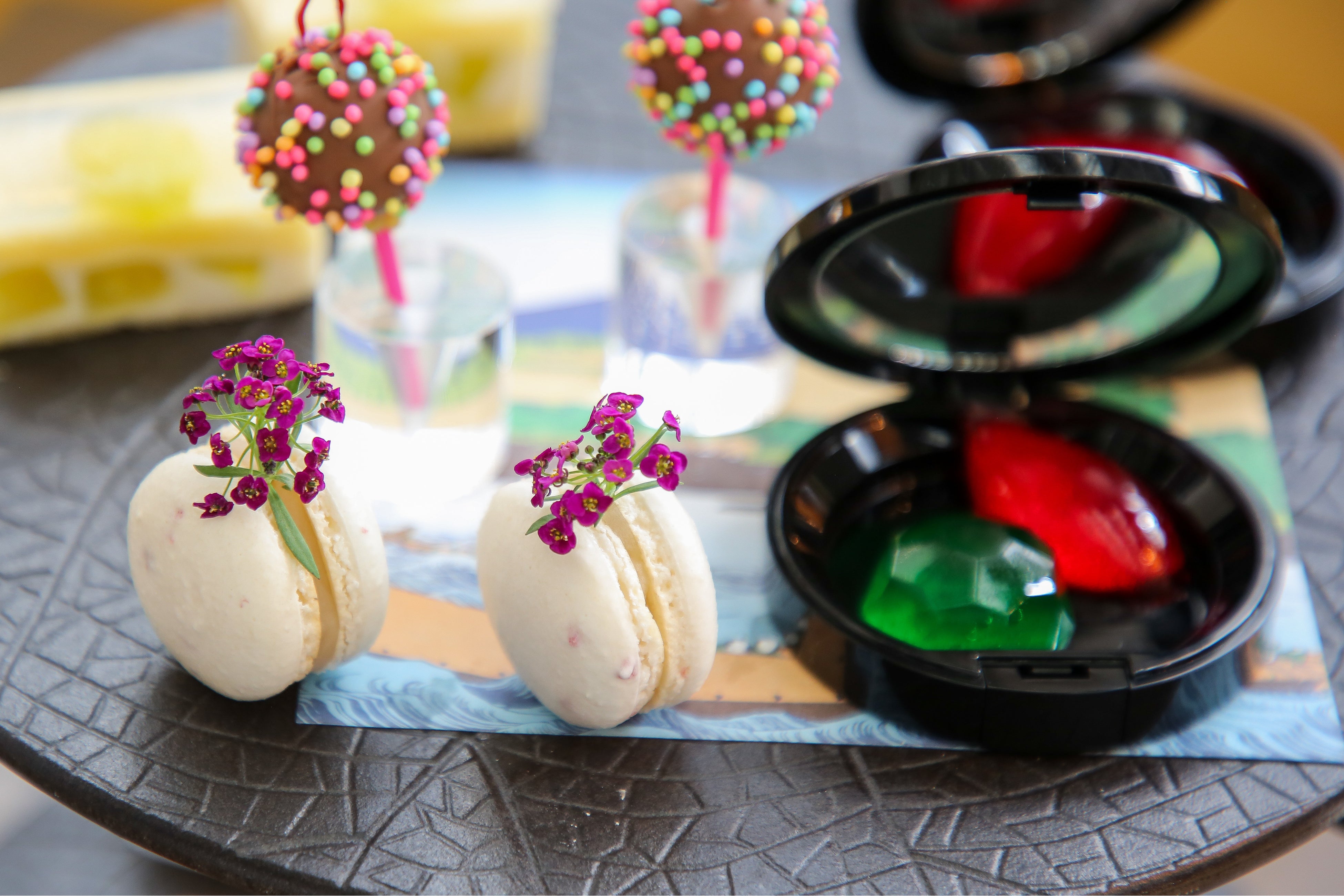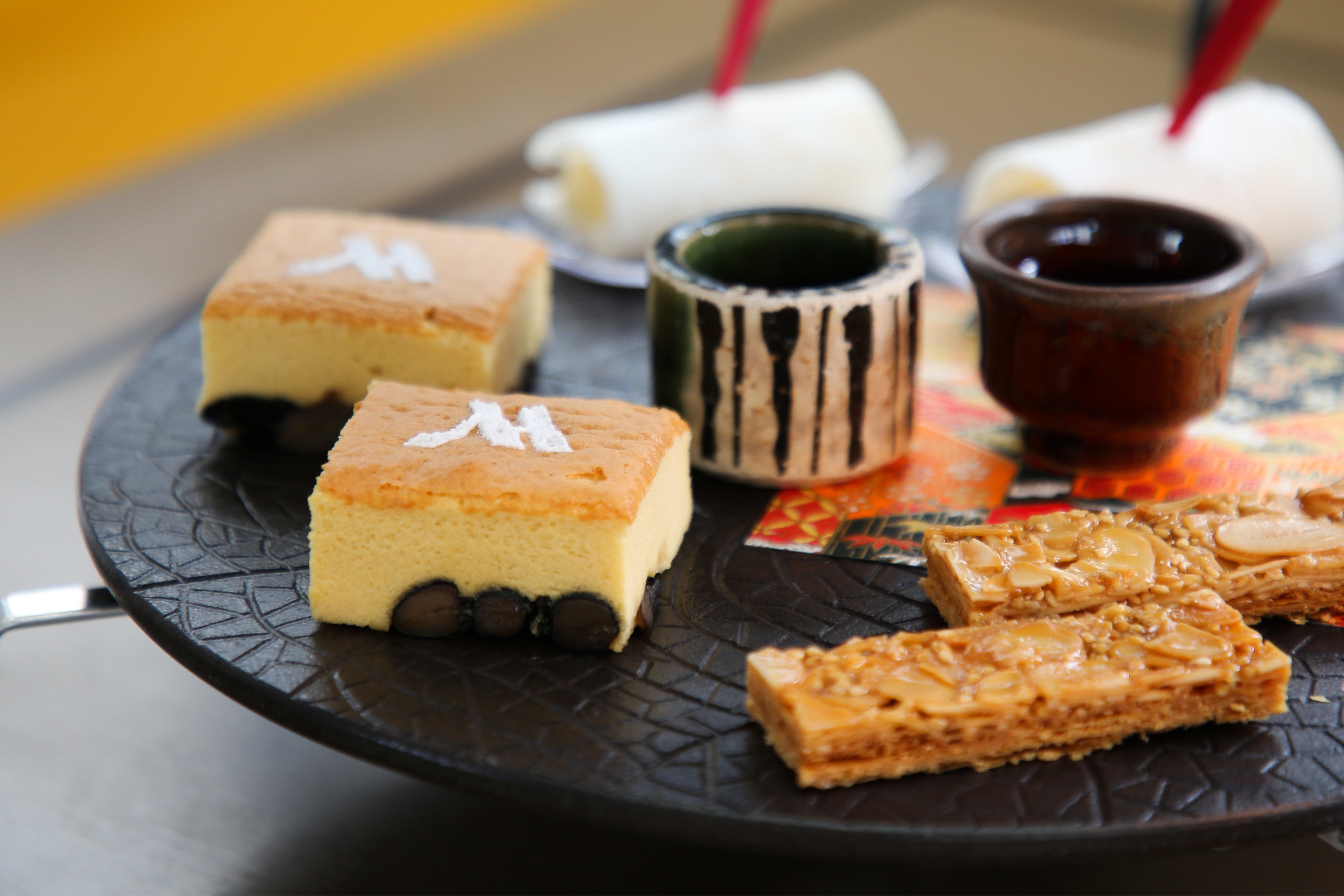 Dessert(一部抜粋):マスクメロンの寒天寄せ 白羊羹 塩こうじ桜あんのマカロン 鷹の爪入り ミルクチョコガナッシュのポッピンチョコ クリームチーズとカスタードの牛皮包み 白胡麻とナッツの味噌フロランタン 和三盆糖と黒豆入りソフトカステラ、メープルとジャパニーズウィスキーのシロップ エメラルドとルビーを模した琥珀羹