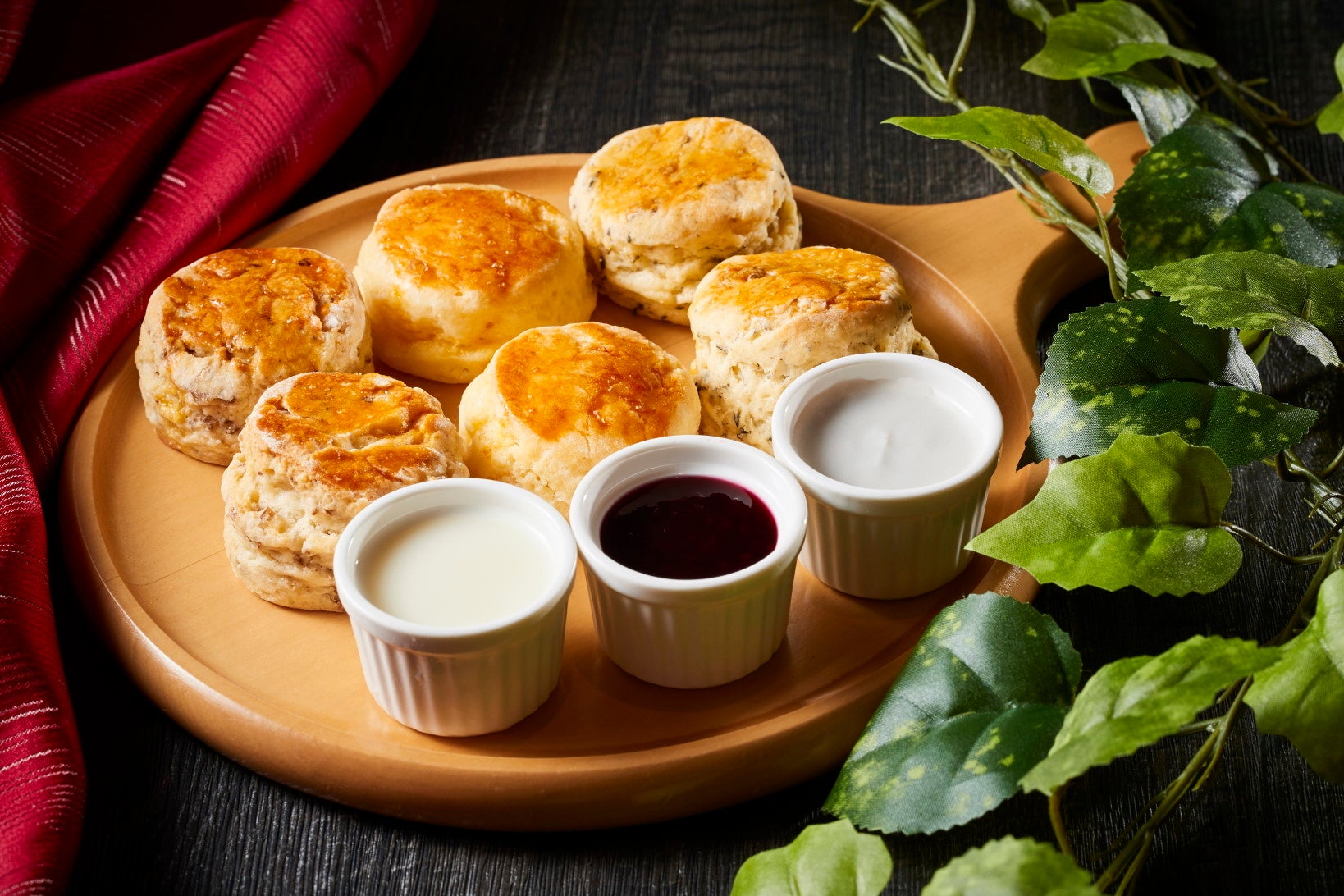 季節のフルーツを使い色鮮やかに仕上げた洋風スイーツと、ゴマ団子やエッグタルト、杏仁豆腐などの中華風スイーツが味のバリエーションを広げます。自家製スコーンはホテルパティシエが焼き上げる中華風ジャスミンを加えた3種類に、様々な味覚のマリアージュをお楽しみいただけるライチ/ココナッツミルク/ブルーベリーのディップソースを添えてご提供いたします。お飲み物は中国茶を中心に、チャイナテラス・アフタヌーンティーとのバランスを考えた豊富なラインナップを取り揃えております。