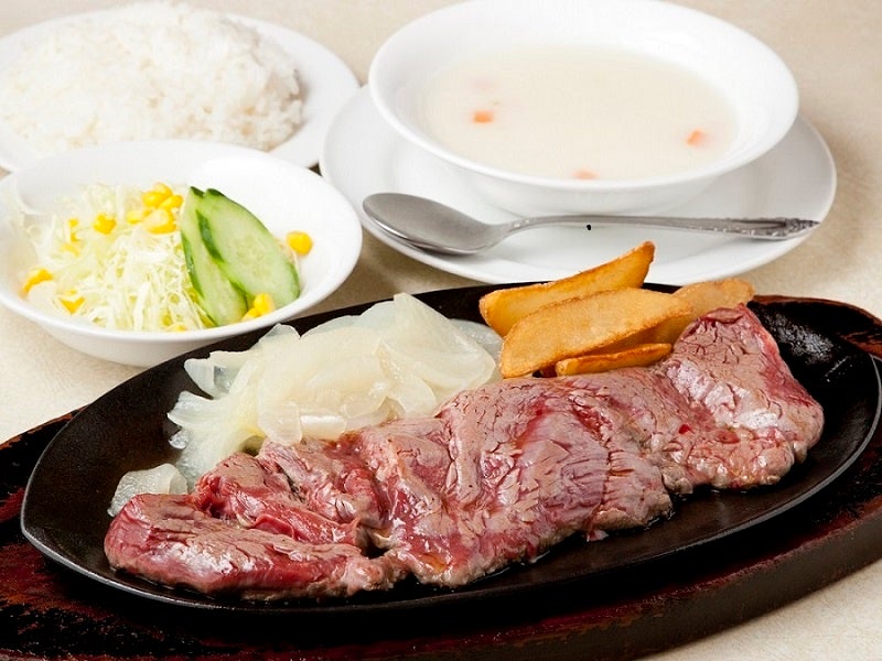 看板メニューであるステーキを注文すると、ステーキ・ポテト・玉ねぎが熱々の鉄板に乗ってジュージューと胸がときめく音を立てながら運ばれてきます。ライスかパンを選ぶ事ができ、お好きな組み合わせでお楽しみ頂けます。