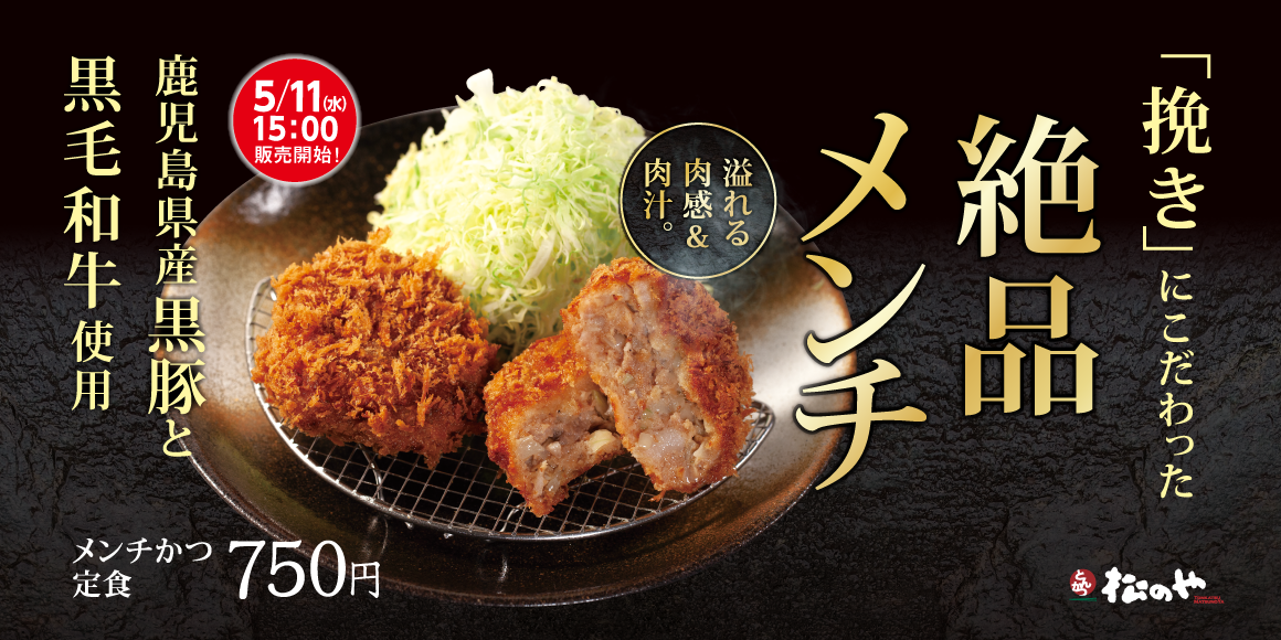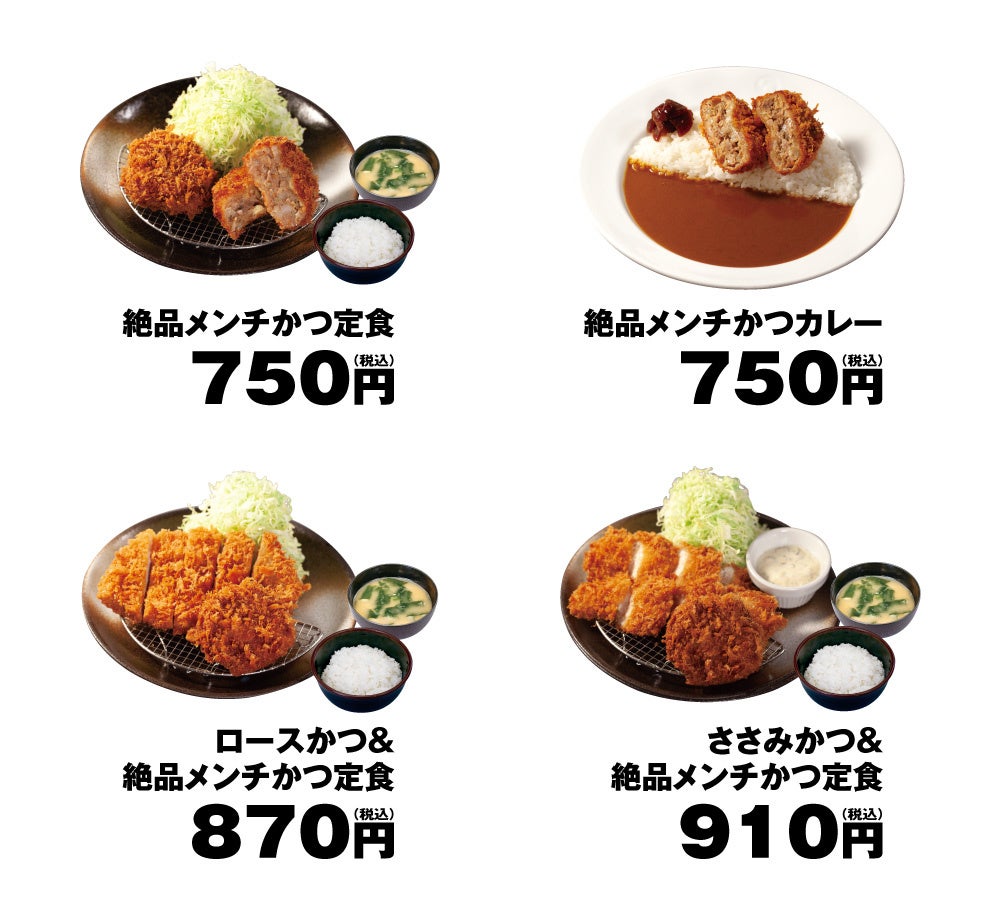 | 商品名 絶品メンチかつ定食 750円 ロースかつ&絶品メンチかつ定食 870円 ささみかつ&絶品メンチかつ定食 910円 絶品メンチかつカレー 750円 単品絶品メンチかつ 300円 ※お持ち帰りいただけます。お持ち帰りのみそ汁は、別途60円でお買い求めいただけます。 ※全て税込価格です。また、店内・お持ち帰りの税込価格は同一です。 ※松屋併設店では「絶品メンチかつ」関連商品を販売いたしません。 ※マイカリー食堂併設店では「絶品メンチかつカレー」を販売いたしません。 発売日 2022年5月11日(水)午後3時~ |