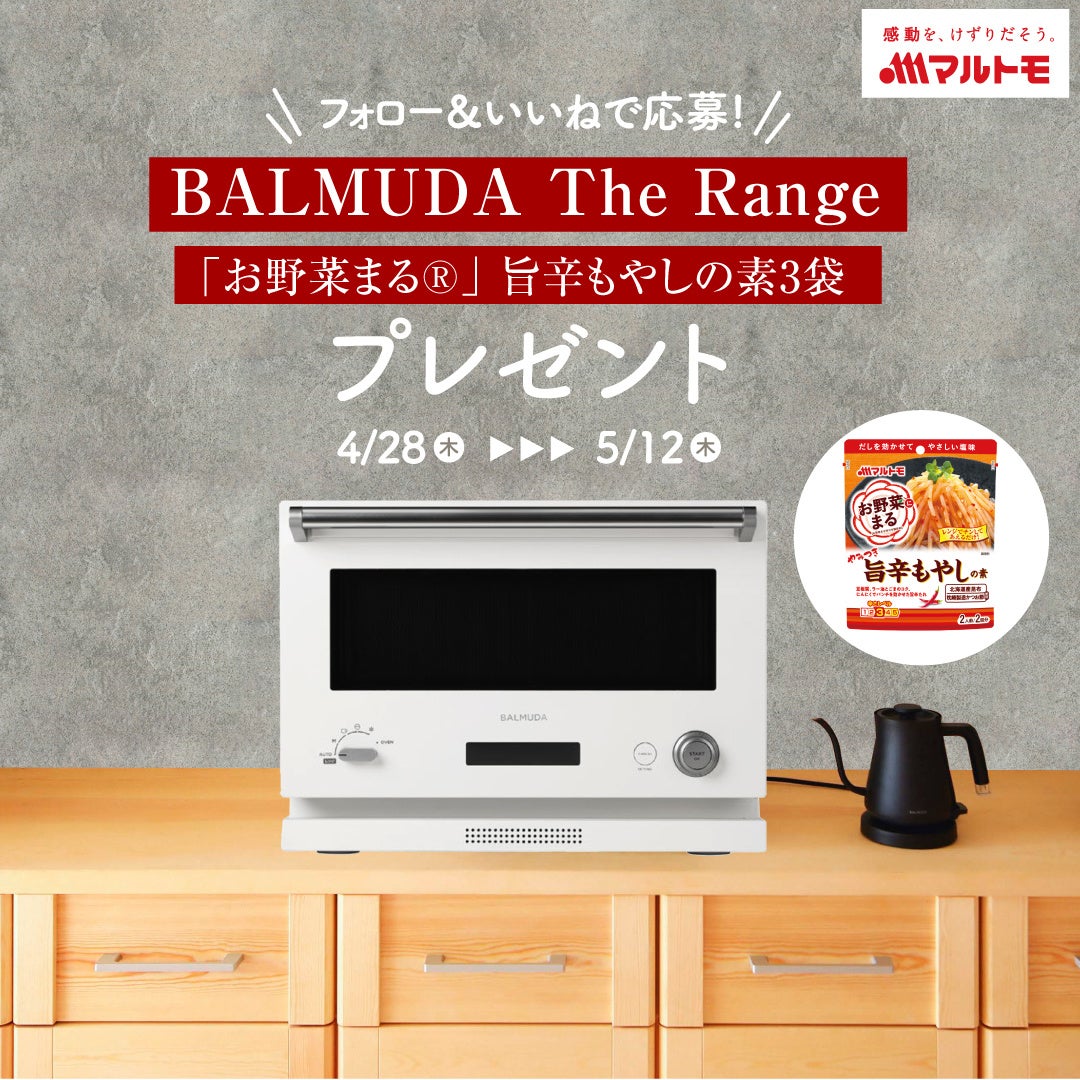 マルトモ株式会社(社長:今井均 本社:愛媛県伊予市)は、マルトモ公式Instagramのフォロワー様が2万人を突破したことを記念し、「BALMUDA︎ The︎ Range」と「お野菜まるⓇ 旨辛もやしの素」のセットが抽選で2名様に当たるキャンペーンを実施します。
