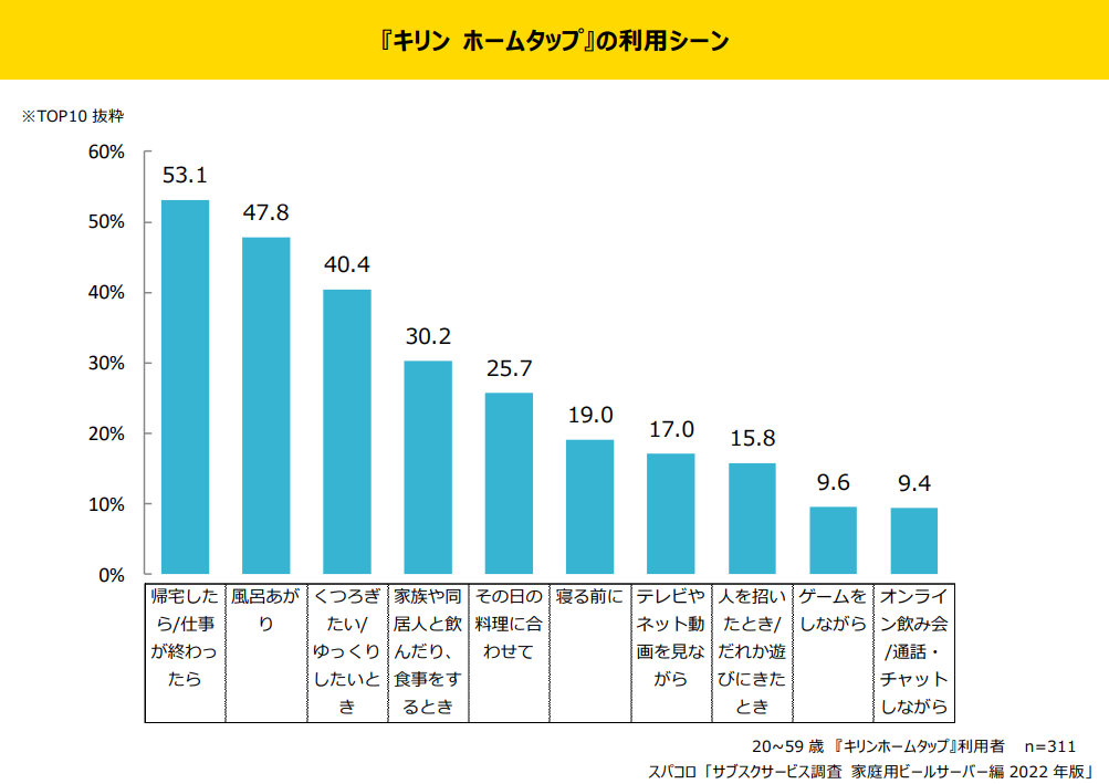 『キリン ホームタップ』を利用するシーンについては、上位から「帰宅したら/仕事が終わったら」53.1%、「風呂あがり」47.8%、「くつろぎたい/ゆっくりしたいとき」40.4%、「家族や同居人と飲んだり、食事をするとき」30.2%、「その日の料理に合わせて」30.2%が続く結果に。オフになるタイミングやリラックスタイムで利用されていることがわかります。