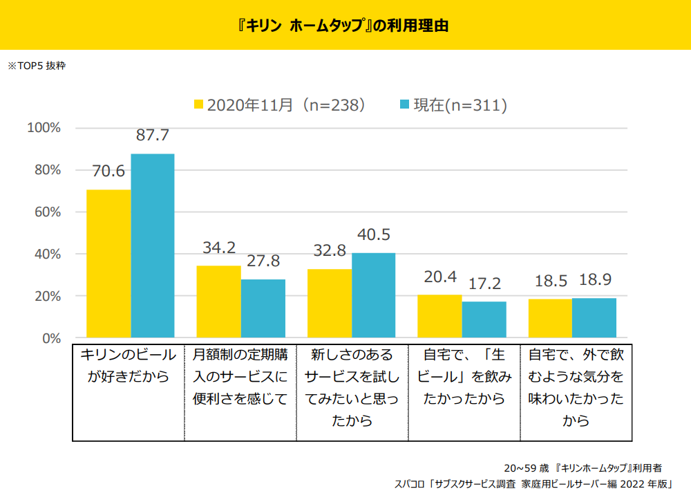 『キリン ホームタップ』を利用しようと思った理由について、利用理由の1位は「キリンのビールが好きだから」で、2020年11月では70.6%、2022年3月で87.7%と17ポイント上昇。引き続きキリンのビールへのロイヤルティの高い顧客が『キリン ホームタップ』を利用していることがわかります。そのほか「新しさのあるサービスを試してみたいと思ったから」で7ポイントほどの上昇がみられます。