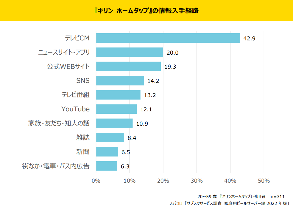 『キリン ホームタップ』の情報入手経路では、「テレビCM」が他を大きく引き離し42.9%でトップ。以降「ニュースサイト・アプリ」20.0%、「公式WEBサイト」19.3%、「SNS」14.2%、「テレビ番組」13.2%が続く結果となりました。現状の情報入手経路は「テレビCM」1強状態であることがわかります。