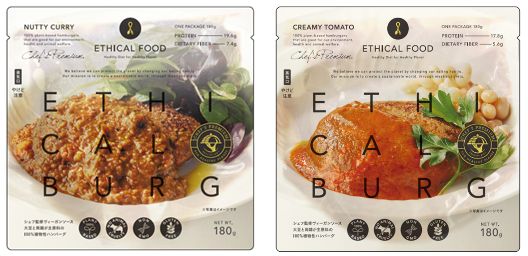 ETHICAL BURG Chef’s Premium(エシカルバーグ シェフズ・プレミアム)は、エシカルフード株式会社が群馬の老舗こんにゃくメーカー茂木食品工業と共同開発した100%植物性の「ETHICAL BURG(エシカルバーグ)」をベースに、人気イタリアンレストラン、ブリアンツァグループのオーナーシェフ、奥野義幸氏が監修した2種類の特製ヴィーガンソース(カレー・トマトクリーム)を合わせています。