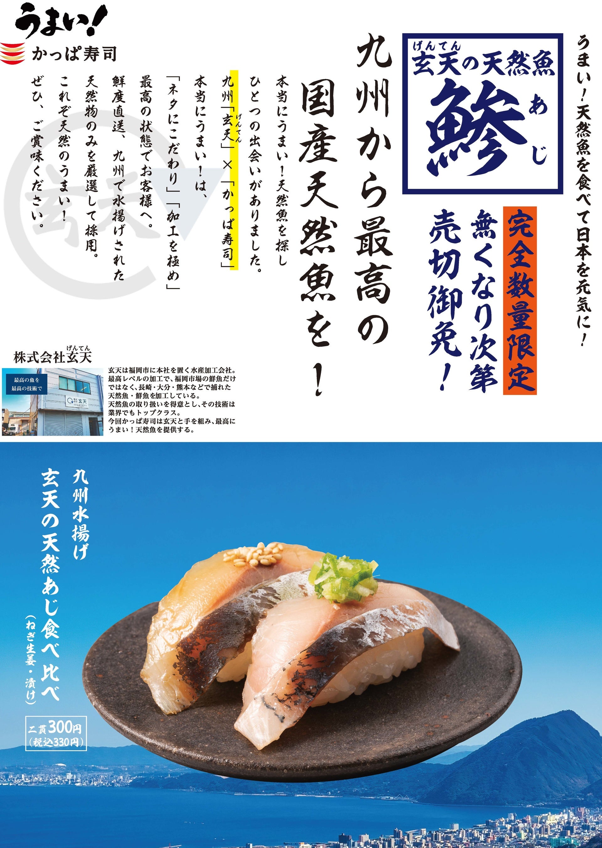 - 天然魚加工トップクラスの水産加工会社「玄天」×「かっぱ寿司」第二弾!“九州のあじ”