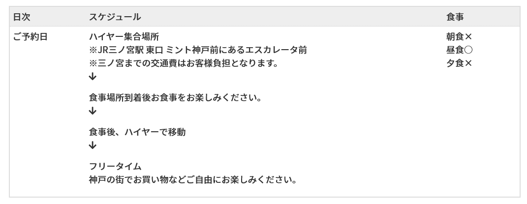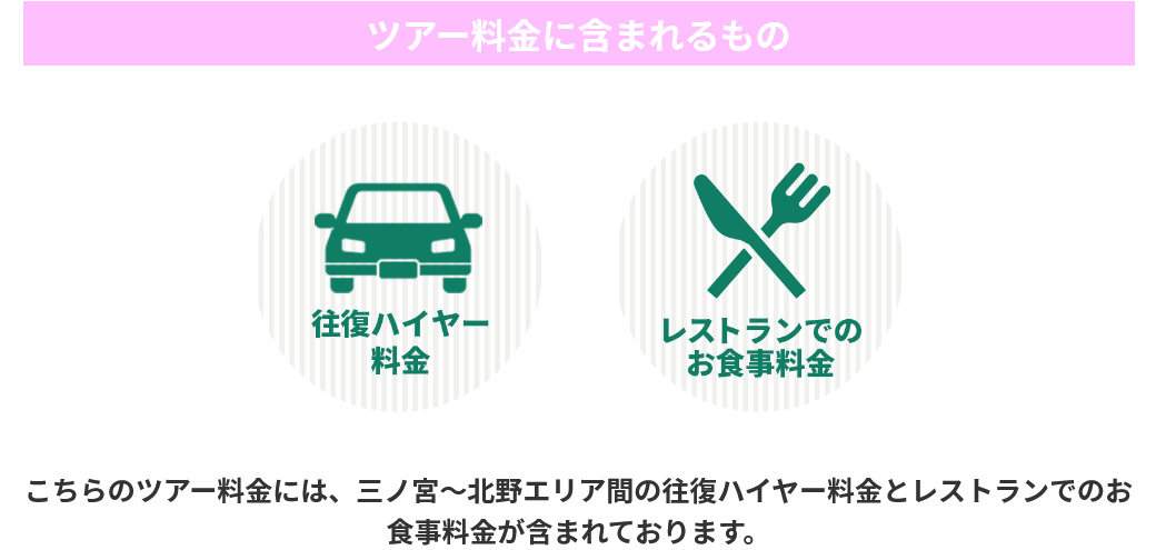 こちらのツアー料金には、三ノ宮~北野エリア間の往復ハイヤー料金とレストランでのお食事料金が含まれております。