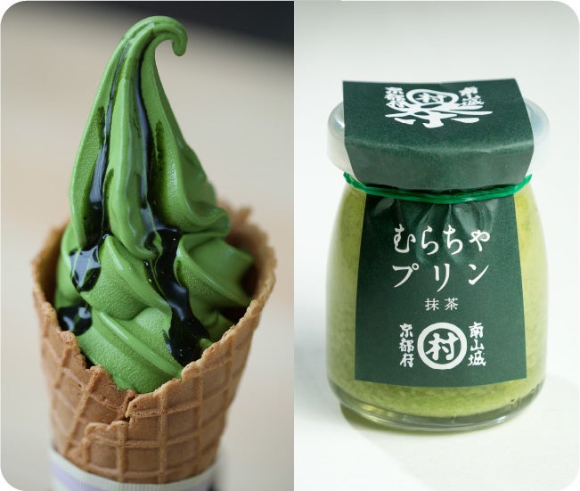 村抹茶ソフトクリーム(1個)440円、むらちゃプリン〈抹茶〉(1個)432円