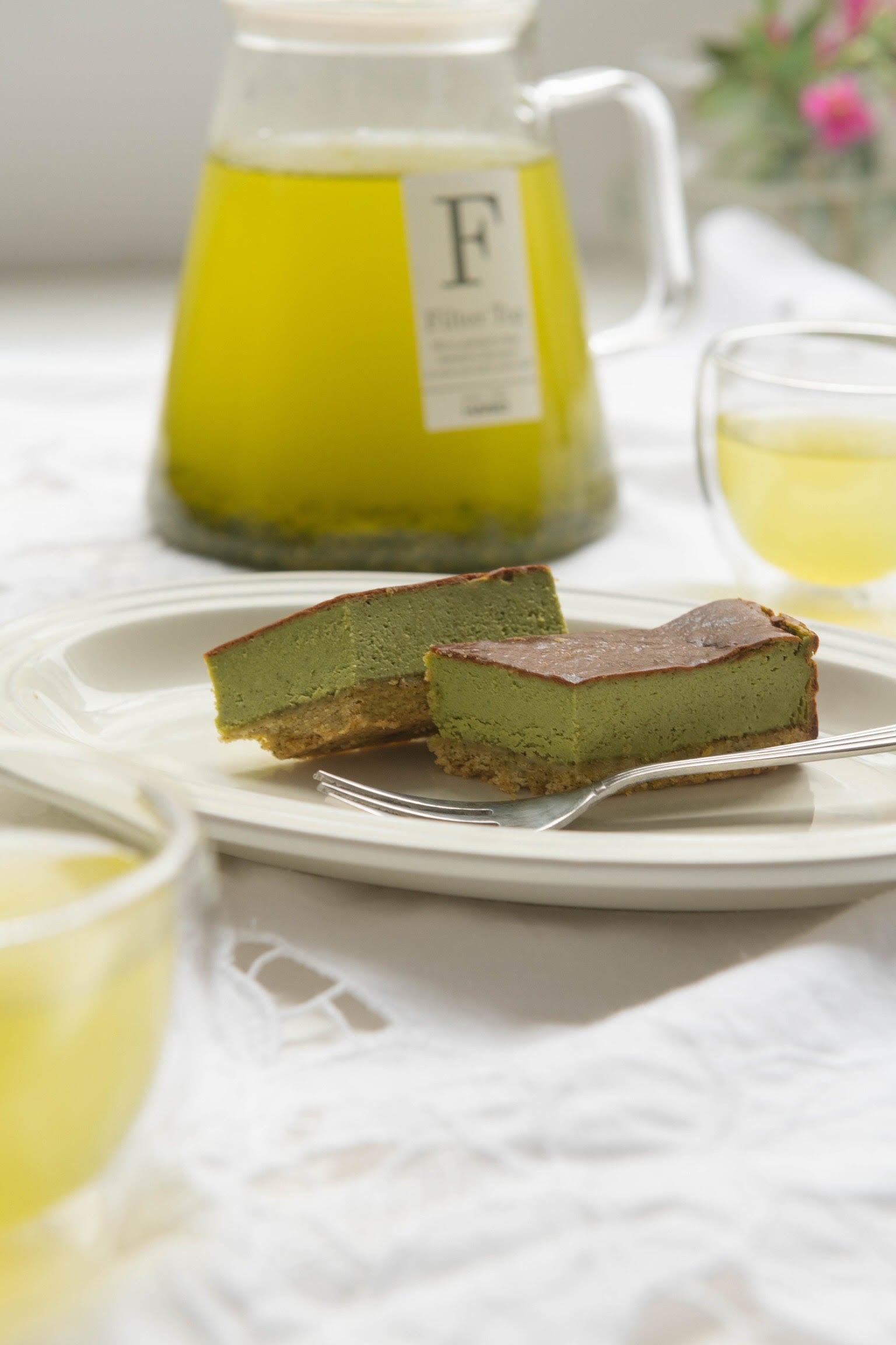 濃厚な抹茶の味と香りが楽しめるチーズケーキは今年の新茶、静岡県産の深蒸し茶とともに。