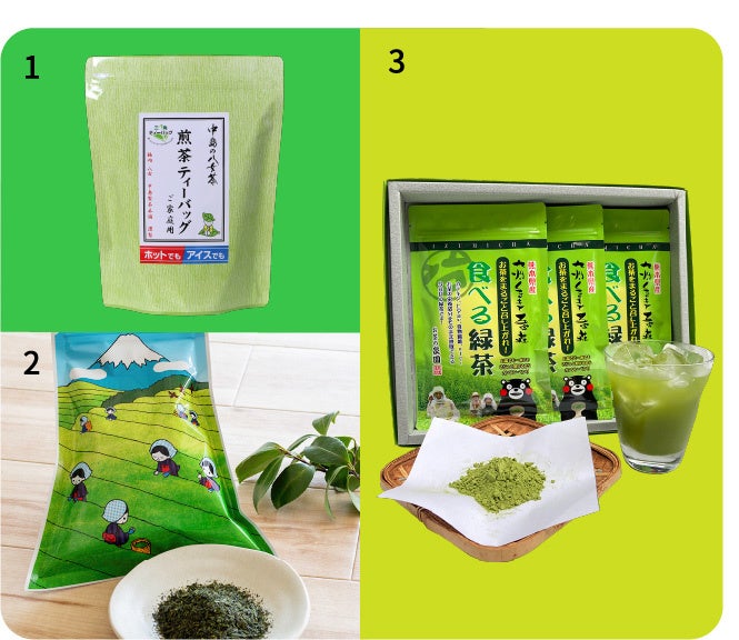 1.八女茶 上煎茶ティーバッグ(5g×50包入り)1,296円、八十八夜摘新茶(100g)1,080円