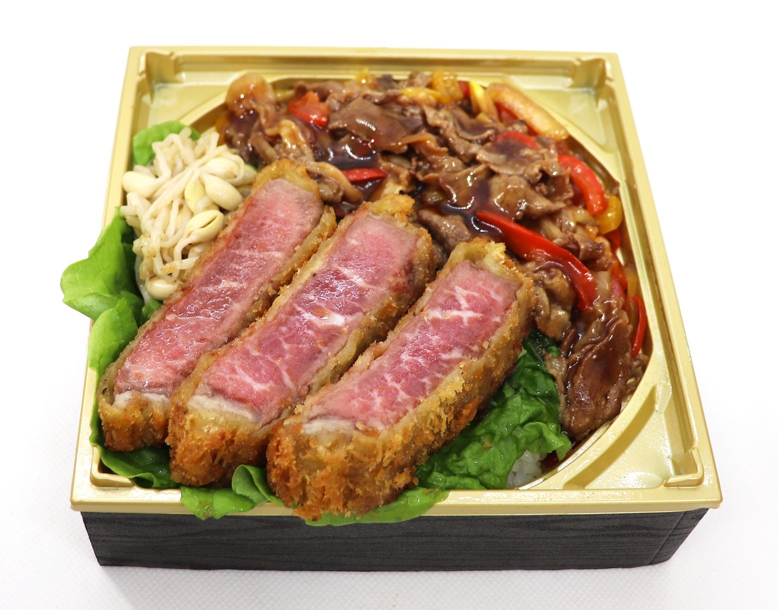 「京都食肉市場直送」の国産黒毛和牛を使用した弘特製ビフカツと牛肉オイスターソース炒めの、がっつり贅沢どんぶり!