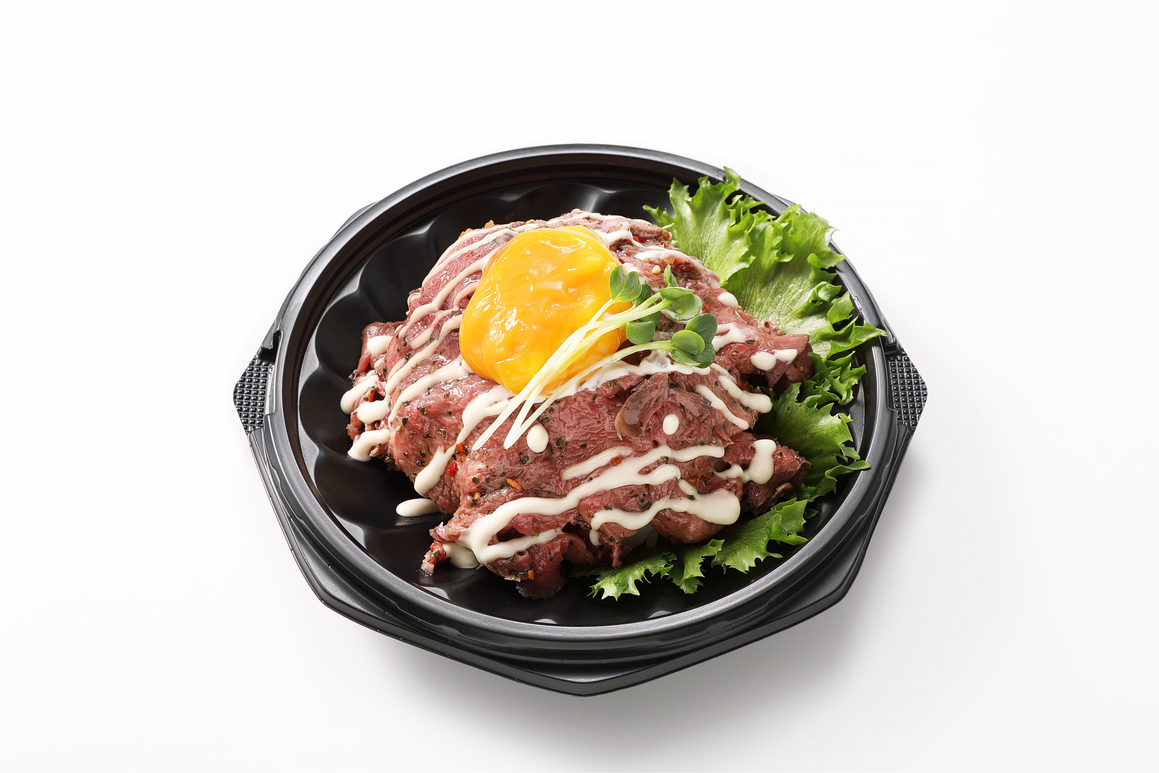 ローストビーフの切り落としを使用し、バジル風味ソースとマヨソーズネースを絡めた丼です。