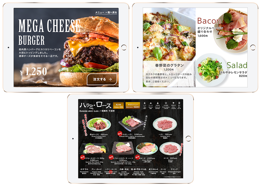 イグレック社の「iPadセルフオーダー」は、他の多くのセルフオーダーシステムで採用されている「固定レイアウトデザイン」ではなく、「完全フリーレイアウトデザイン」を採用しています。そのため、iPadならではの画像の鮮明さを活かしながら、お好きなメニュー構成が実現でき、お客様の購買意欲UPにつながります。動画やスライドショーも流せるので、イベントの告知や姉妹店情報、美味しい食べ方の説明など、お客様に知っていただきたい情報を配信できます。