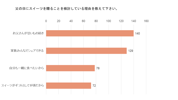 父の日にスイーツを贈る背景に、1位に「お父さんが甘いもの好き」2位、3位には「家族みんなでシェアできる」「自分も一緒に食べたい」といった理由が挙げられました。お父さんが好きなものを贈りたい、一緒にお祝いしたいといったニーズが伺えます。