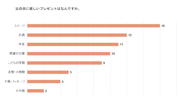 父の日に欲しいプレゼントの1位はお酒かと思いきや、トップに「スイーツ」、2位に「お酒」が挙げられ、甘いもの好きなお父さんが多いことが伺えます。
