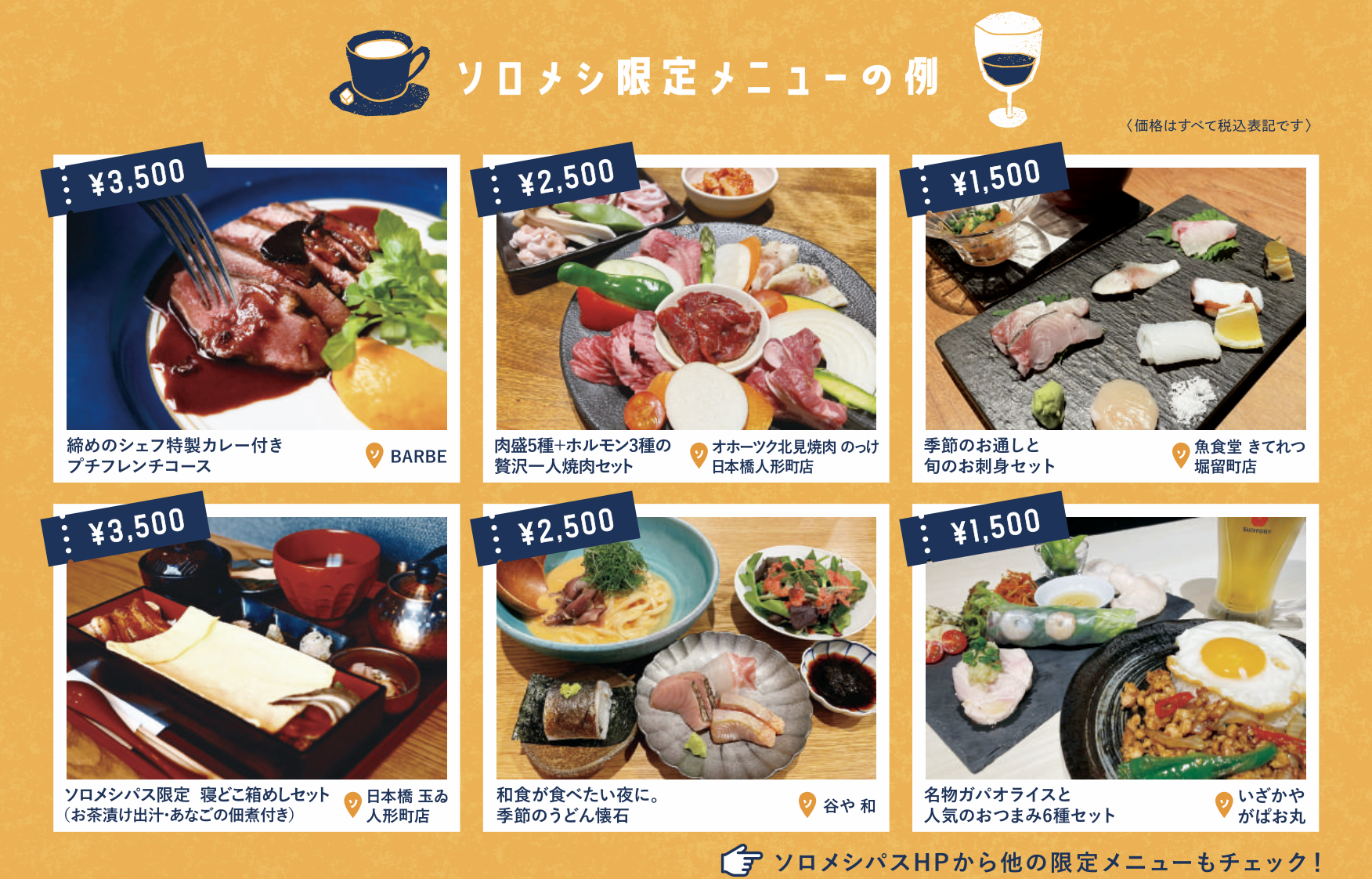 といったおひとりさまの悩みや不安に応えるべく、人気メニューの組み合わせや、一人向けのセット・コースなど各店の特徴を生かした「ソロメシ限定メニュー」をご用意しています。