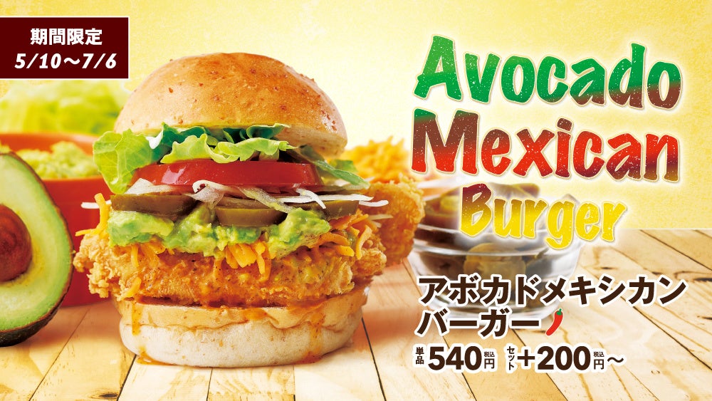 毎年、初夏を感じるこの時期の恒例商品として、暑さを乗り切りたい女性を応援するため、さっぱりワカモレディップに仕立てたアボカドを使用したアボカドチキンバーガーを用意し、ご好評をいただいております。今年はちょい辛ハラペーニョ、チェダーチーズの具材をトッピングし、ソースには9種類のスパイスをブレンドした味わい深いコブサラダドレッシングを使用したメキシカンテイストでお楽しみください。