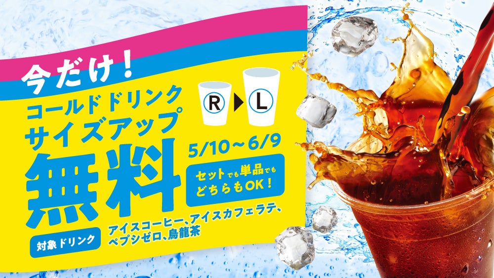 時間帯関係なく、セットドリンク注文でも単品注文でもサイズアップが無料でお楽しみいただけるので、期間中は是非お得なキャンペーンをご利用ください。